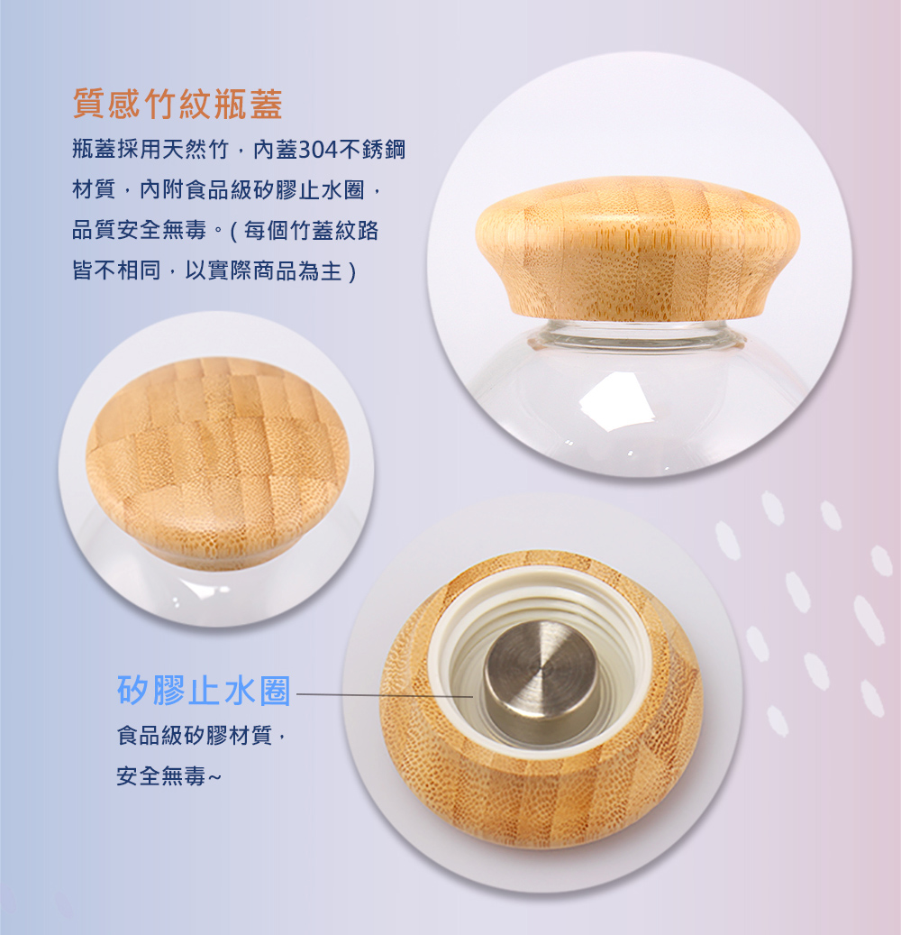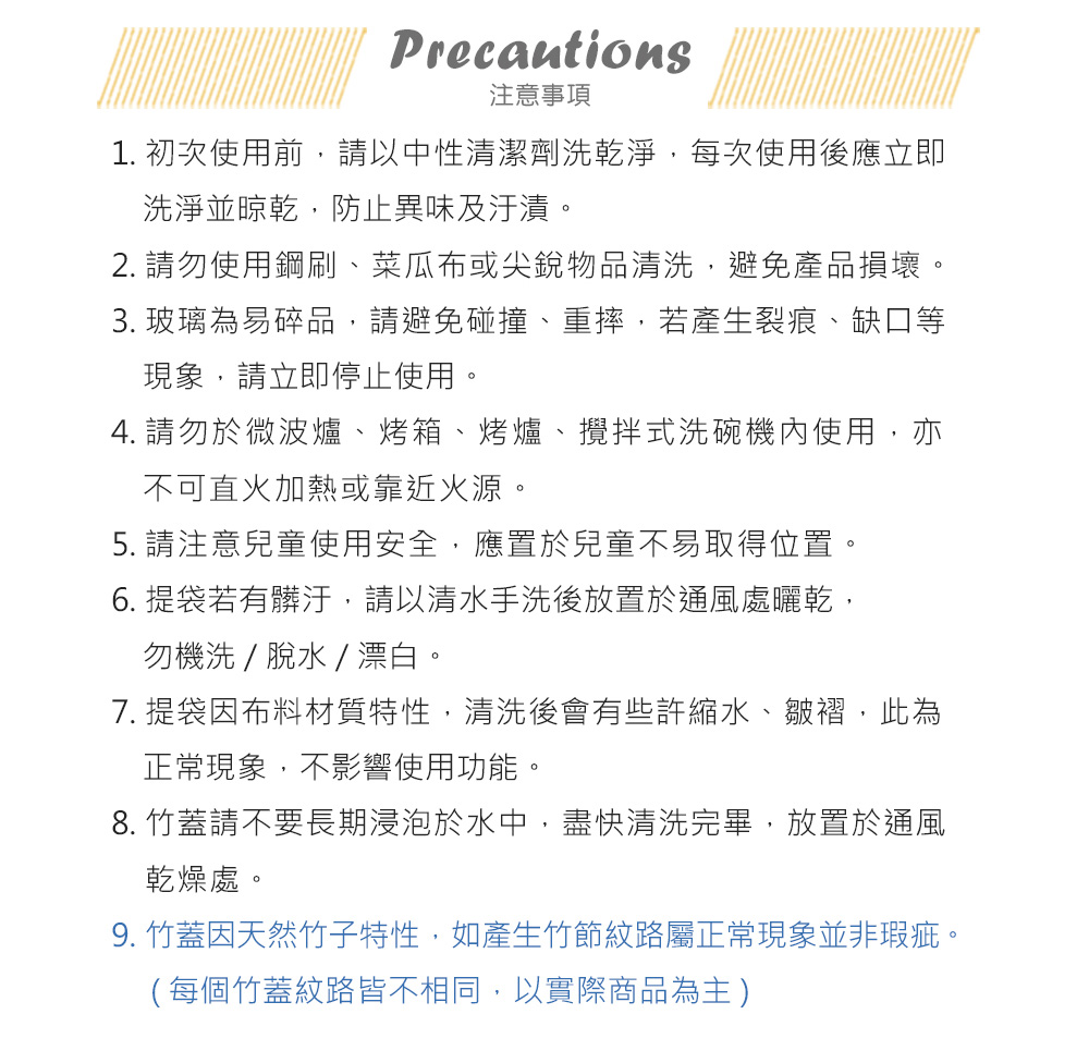1.初次使用前,請以中性清潔劑洗乾淨,每次使用後應立即洗淨並晾乾,防止異味及汙漬。2.請勿使用鋼刷、菜瓜布或尖銳物品清洗,避免產品損壞。3.玻璃為易碎品,請避免碰撞、重摔,若產生裂痕、缺口等現象,請立即停止使用。4.請勿於微波爐、烤箱、烤爐、攪拌式洗碗機內使用,亦不可直火加熱或靠近火源。5.請注意兒童使用安全,應置於兒童不易取得位置。6.提袋若有髒汙,請以清水手洗後放置於通風處曬乾,勿機洗 / 脫水 / 漂白。7.提袋因布料材質特性,清洗後會有些許縮水、皺褶,此為正常現象,不影響使用功能。8.竹蓋請不要長期浸泡於水中,盡快清洗完畢,放置於通風乾燥處。 9.竹蓋因天然竹子特性,如產生竹節紋路屬正常現象並非瑕疵。(每個竹蓋紋路皆不相同,以實際商品為主)