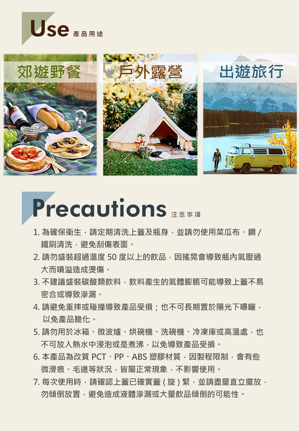 7. 每次使用時,請確認上蓋已確實蓋(旋)緊,並請盡量直立擺放,勿傾倒放置,避免造成液體滲漏或大量飲品傾倒的可能性。
