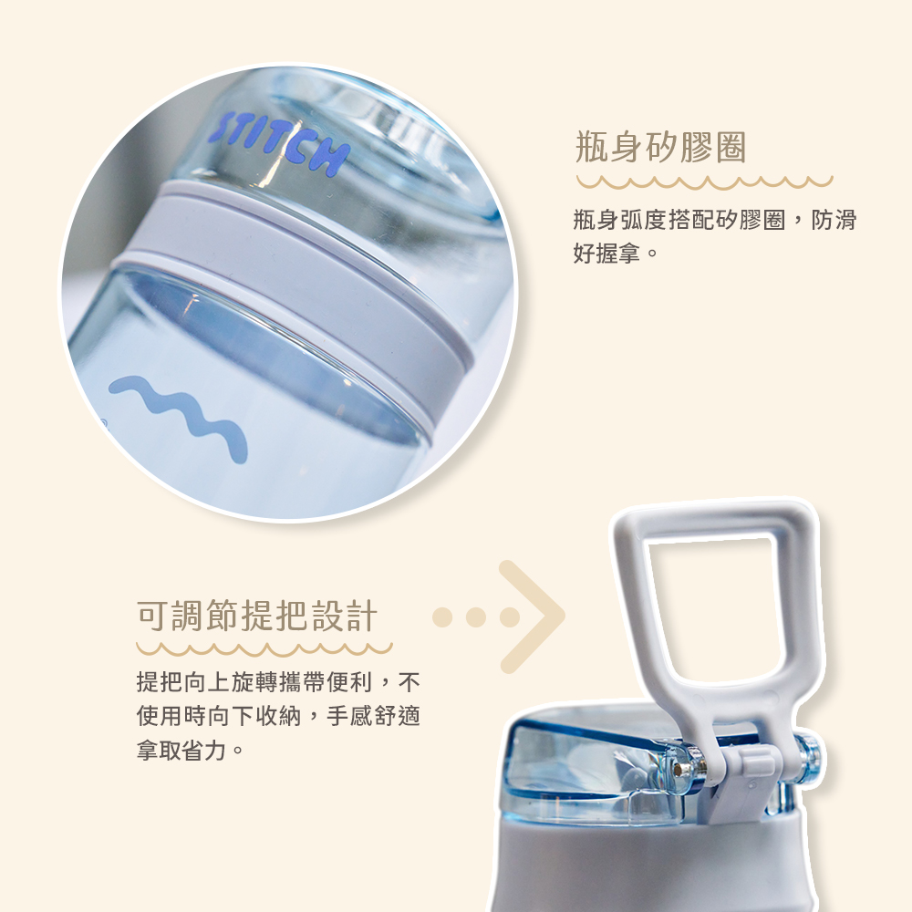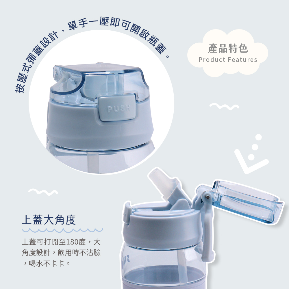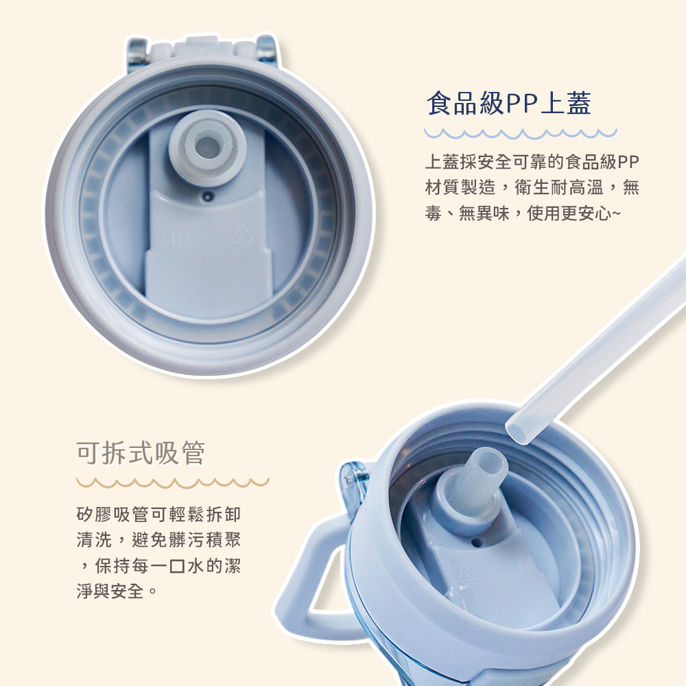材 質:瓶身 - 改質PCT (Tritan) / 上蓋 - PP、透明蓋 - PC、按鈕 - ABS、矽膠止漏圈 / 吸嘴 - 矽膠 / 吸管 - PE / 提手 - TPR/ 防滑圈 - 矽膠