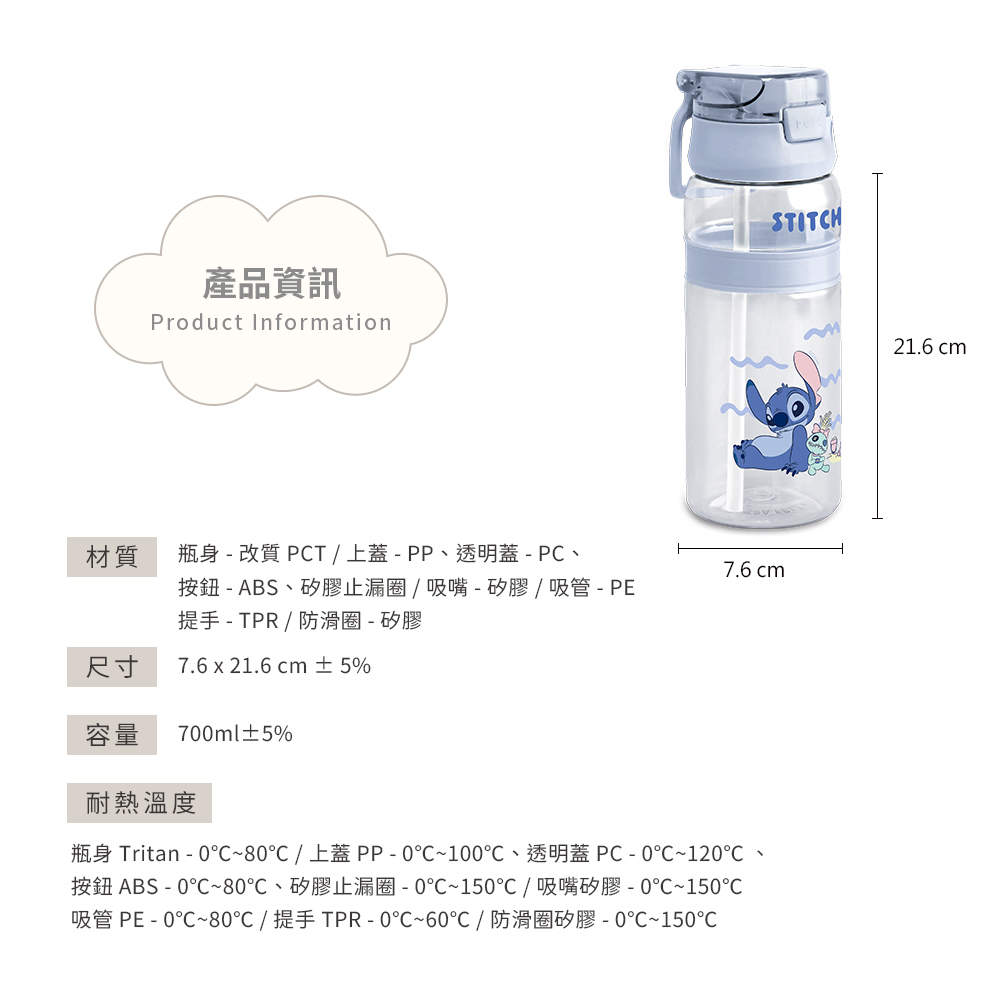 耐熱溫度:瓶身Tritan - 0℃~80℃ / 上蓋PP - 0℃~100℃、透明蓋PC - 0℃~120℃ 、按鈕ABS - 0℃~80℃、矽膠止漏圈 - 0℃~150℃ / 吸嘴矽膠 - 0℃~150℃ / 吸管PE - 0℃~80℃ / 提手TPR - 0℃~60℃ / 防滑圈矽膠 - 0℃~150℃