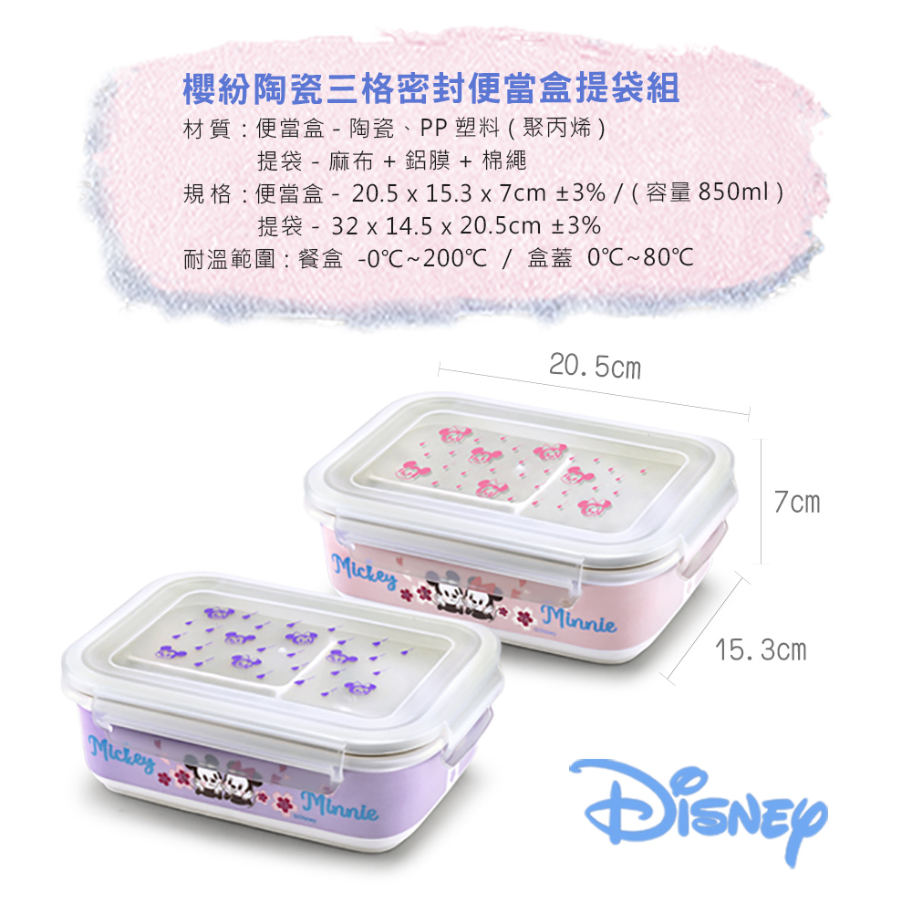 Disney 迪士尼櫻紛米奇三格密封陶瓷餐盒保溫提袋組