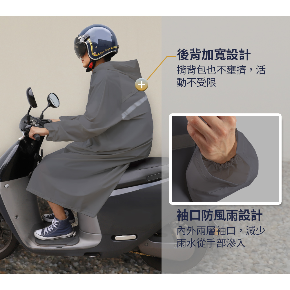 快速穿脫,通風不悶熱✔️胸口多層防護,不易滲水✔️前後反光條,高能見度更安全✔️後背通風設計,雨季不悶熱✔️貼心內束口,衣服袖口不淋濕