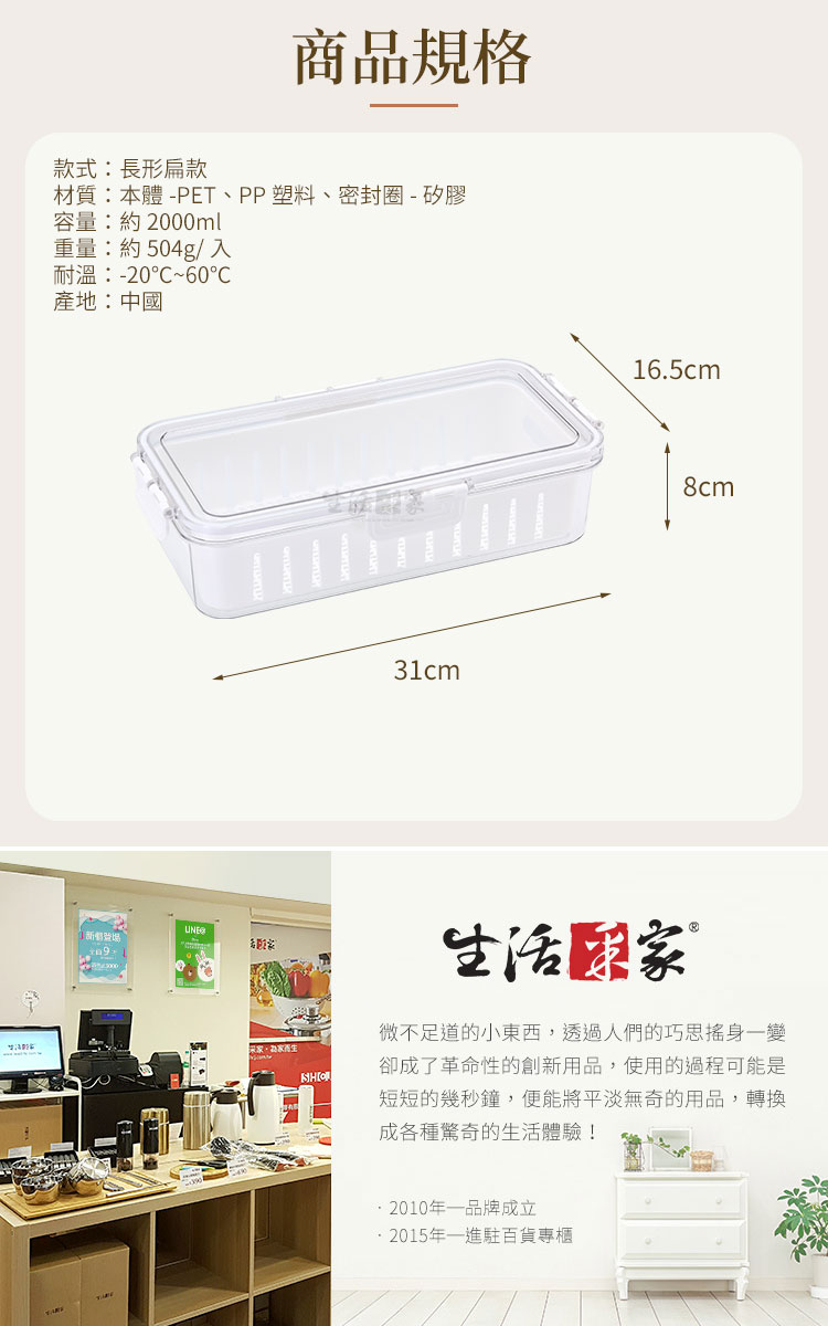 加厚瀝水保鮮盒 長形扁款2L,冰箱收納新革命在忙碌的生活裡,冰箱常常變得雜亂無章?蔬果與生鮮混放,不僅容易串味,還可能加速腐壞。別擔心!生活采家加厚瀝水保鮮盒-長形扁款2L,專為「愛料理的家庭」與「注重生活品質的族群」設計,幫助您輕鬆解決冰箱收納與保鮮的痛點。✅ 長形扁款設計,容量達2L:可輕鬆放置整條魚、雞腿或蔬菜,不再被冰箱空間限制。✅ 內置瀝水籃:洗好蔬果直接放入,瀝水不積液,保持清爽,延長保鮮時間。✅ 食品級PET+PP材質:不含雙酚A,通過SGS檢驗,無毒無味,可安心接觸食材。✅ 透明上蓋+密封膠條:清楚看見內容物,取用快速,同時有效隔絕異味。✅ 堆疊收納設計:冰箱井然有序,節省空間,告別雜亂。🌈 使用後你會發現~冰箱更清爽,食材更安心想像一下,下班後打開冰箱,看到的是整齊分區的食材盒:魚肉、雞肉、蔬果、零食,清楚可見,拿取方便。✔ 不再有異味混雜✔ 不再為找不到食材而煩惱✔ 不再因保存不當而浪費食材如果您想要:👉 食材新鮮更持久👉 冰箱整潔有序✔ 安全無毒的保鮮盒那麼 生活采家加厚瀝水保鮮盒-長形扁款2L 絕對是您的最佳選擇。現在就入手,讓每一次打開冰箱都充滿「幸福感」!👉 快來體驗不一樣的冰箱收納,讓廚房成為您的療癒空間。#冰箱收納神器 #瀝水保鮮盒 #食材保鮮 #廚房必備 #生活采家📣 FAQ (常見問答)Q1:這款保鮮盒耐熱嗎?A1:耐溫範圍為 -20℃~60℃,可用於冷藏、冷凍,但不建議微波或烤箱使用。Q2:瀝水籃可以分開使用嗎?A2:可以,內籃可單獨取出使用,方便清洗或直接盛裝食材。Q3:容量多大?適合放哪些食材?A3:容量約2L,適合魚類、雞腿、蔬菜、水果等,尤其適合長條狀或較大片的食材。Q4:會有塑膠異味嗎?A4:不會,產品通過SGS檢驗,不含雙酚A,安全無毒,可直接接觸食材。Q5:可以堆疊嗎?會不會滑動?A5:可以堆疊,設計平穩,卡扣密封牢固,不會輕易滑動。注意事項:1.請勿重摔或高處掉落,以免商品受損。2.請勿接近高溫或勿近火源處,以免商品受損。3.商品情境圖片僅供參考,實際出貨不含週邊道具及配件。