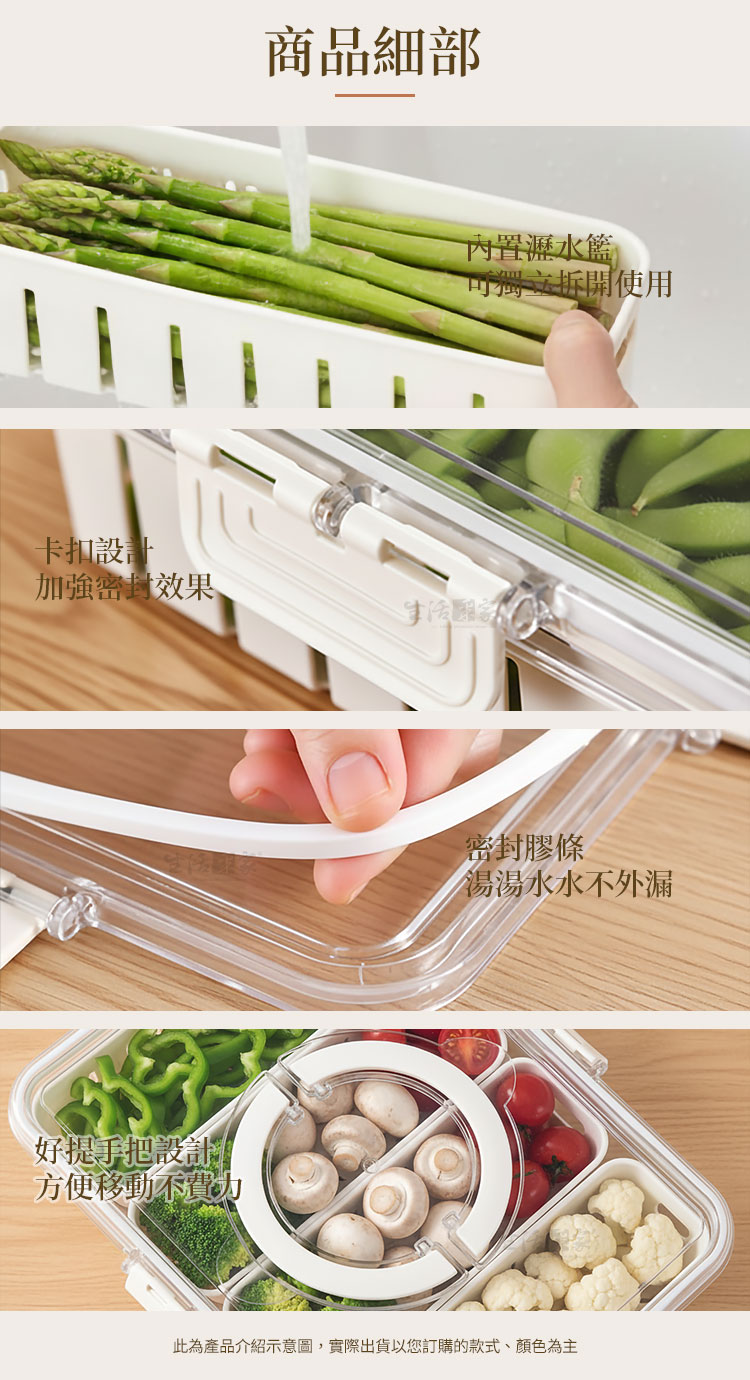 🍔 保鮮度UPUP! 🍔嗨!各位吃貨們!想像一下,有一個能同時兼顧實用和時尚的瀝水保鮮盒有多好?沒錯,這款就是你的不二之選哦!🌟🍅🥒我們的密封瀝水保鮮盒設計簡單卻極具實用性,將你的備料保存得又新鮮又美味。完美密封的設計確保食材保持水分,保鮮效果無與倫比!🔒💧️多功能分格設計,盡情搭配不怕混味: 4分格的獨特設計,讓你可以同時攜帶多種食材,再也不怕味道混在一起啦,馬上搭配你喜歡的食材吧!💦瀝水功能,食材保鮮無虞: 貼心瀝水設計,讓你放心存放蔬菜、水果、海鮮等,不再擔心食材泡水爛掉,新鮮隨時享受!💪首推加厚設計,保證你絕對滿意: 想擁有一個耐用又結實的保鮮盒嗎?這款保鮮盒就是為你而設計的,加厚及瀝水的設計絕對能讓你滿意。🔜多功能使用:不僅適用於存放肉類,還能保存蔬菜、水果和小吃,滿足你的各種烹飪需求。更重要的是,你可以輕鬆堆疊它們,節省櫥櫃空間!🥒🍇💯隨時隨地,輕鬆外出: 有了這個手提設計,無論是上班族、學生還是喜歡戶外活動的你,都能隨時隨地,想吃什麼就帶什麼,方便又實用。❤️高品質材料,安全有保障: 我們用的都是PP及PET材料,絕對安全,讓你和家人吃得開心。👉清洗方便,使用輕鬆: 輕鬆清洗,耐用耐用!不僅適合冰箱存儲,還可以放心微波加熱。這款4分格瀝水保鮮盒,將為你的生活增添更多便捷和多樣性。別猶豫了,快來入手吧,讓美味隨時陪伴!🛒🍲美味與便利就是你日常的主旋律~趕緊入手,讓飲食新境界隨時陪伴你!🛒🍲注意事項:1.請勿重摔或高處掉落,以免商品受損。2.請勿接近高溫或勿近火源處,以免商品受損。3.商品情境圖片僅供參考,實際出貨不含週邊道具及配件。