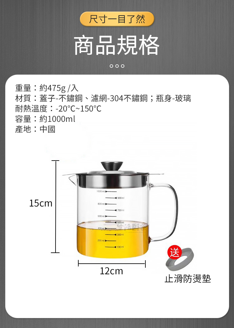 商品規格:1.尺寸:約直徑12*高15cm2.材質:壼身-高硼硅玻璃、濾網-304不鏽鋼、蓋子-201不鏽鋼3.耐熱:-20℃~150℃4.重量:約475g/入5.產地:中國6.附贈:止滑防燙墊*17.商品:高硼硅玻璃濾油壼*1※商品為人工丈量略有誤差,請以實品為準。※網頁圖片因拍攝關係或螢幕設定不同而會與實際商品略有色差,請以實際收到商品為準。