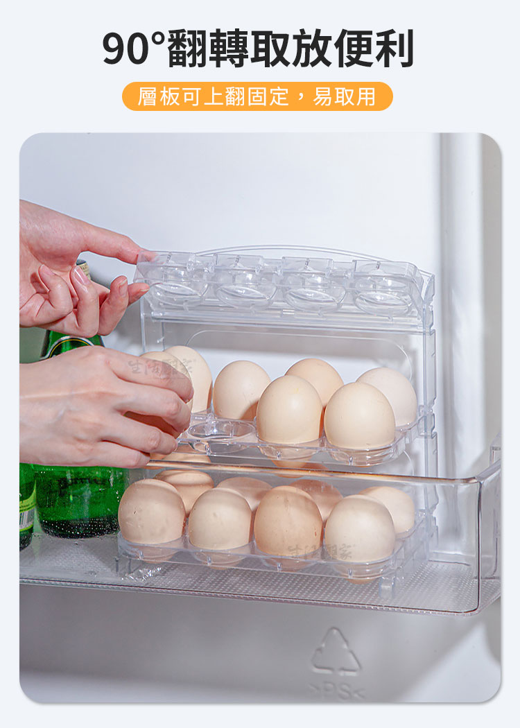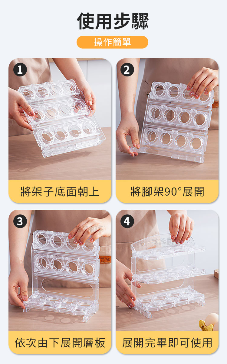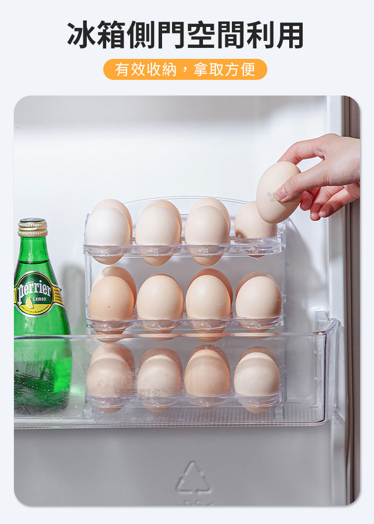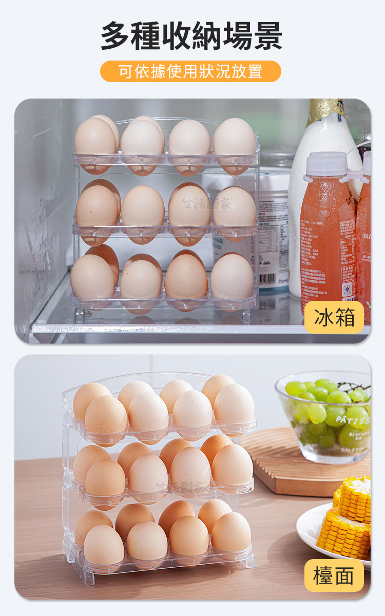 雞蛋買回家,整袋就直進冰箱嗎?通常我會將每顆蛋洗一洗,再擺上蛋架存放保鮮,一來也不怕蛋殼上的細菌,二來也能確保每顆蛋不會相互碰撞破裂!能有一個蛋架讓我存放是很方便的,今天要推薦給大家一款超實用的蛋架「可折疊三層24顆保鮮雞蛋架」!我一次就能放24顆蛋,真的很會放!🍳🌟這款蛋架可以「折疊存放不佔空間」,當不使用時可以折疊成薄薄的一片,塞在角落或櫥櫃旁邊,完全不佔空間,簡直是空間收納的福音!它還有三層設計,每層可翻轉折疊,使用更靈活方便。🌀✨它有「24格大容量」,它有三層,每層8格,總共可以存放24顆雞蛋,完全能滿足我們家用蛋數量的需求。最棒的是,它可以放在冰箱側門,節省了不少空間!🚪❄️「立式分格分層排列」,每顆雞蛋都有自己的位置,「一蛋一格整齊分明」,再也不用擔心雞蛋滾來滾去了。使用起來也非常穩固,加粗材質設計讓雞蛋架「不易晃動使用更穩固」。💎🍳清洗方面也非常方便,只要用水沖一沖「髒污立刻清洗」,讓我永保持清潔衛生,使用起來更放心。無論是在冰箱內還是台面上,它都是我的好幫手!🧼🌟不僅讓雞蛋收納更整齊,還節省了不少空間!如果你也希望雞蛋能有個獨立的存放空間,那就不能錯過這款「可折疊三層24顆保鮮雞蛋架」,趕快入手吧!你一定會愛上它!🍳🏡#保鮮雞蛋架 #可折疊 #三層設計 #24格大容量 #冰箱收納 #分層排列 #易於清洗 #廚房好物注意事項:1.請勿重摔或高處掉落,以免商品受損。2.請勿接近高溫或勿近火源處,以免商品受損。3.商品情境圖片僅供參考,實際出貨不含週邊道具及配件。