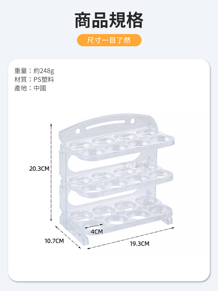 商品規格:1.展開尺寸:約19.3*10.7*20.3cm2.折疊尺寸:約19.3*3*21.5cm3.材質:PS塑料4.重量:約248g/入5.產地:中國6.商品:三層保鮮雞蛋架*1※商品為人工丈量略有誤差,請以實品為準。※網頁圖片因拍攝關係或螢幕設定不同而會與實際商品略有色差,請以實際收到商品為準。