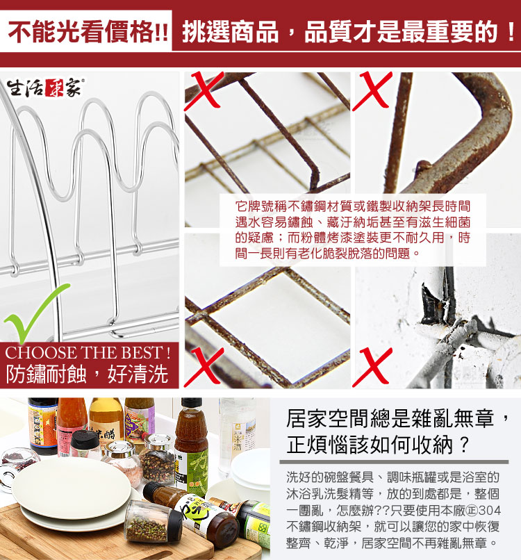 廚房洗完的杯碗、碟盤、抹布等無處風乾嗎?瀝水盤裝不了其它東西嗎??◆豪華型配備,兼具收納與瀝水功能,一機多用絕對划算。◆清潔後的杯子、碗筷、碟盤等都可擺放瀝水風乾,較不會有櫥櫃異味。◆盤架間距可左右調整,對於較深的餐盤或平底鍋等,都可以擺放風乾或收納。◆下方有雙桿抹布掛勾架,清潔後的抹布或小工具等可吊掛風乾收納。◆附說明書,全機採DIY組裝設計,組裝使用、拆卸清潔等都方便。◆底部附瀝水盤,風乾瀝水不外露,抽取式設計,日常可抽取清潔。◆採18-8(㊣304)不鏽鋼材質,不會生鏽,容易清洗保養,經久耐用。◆不鏽鋼材不電鍍,直採採用不鏽鋼本色,長保如新,衛生可靠。◆全架採不鏽鋼材質,不會因日照變質損壞脆裂, 使用壽命更長。◆安裝簡單,掛架採雙邊掛式設計,適用於直徑1.6cm以內的掛桿使用。