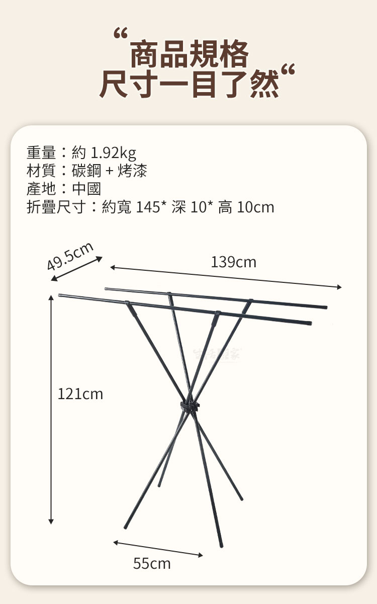 商品規格:1.展開尺寸:約寬139*深49.5*高121cm2.折疊尺寸:約寬145*深10*高10cm3.材質:碳鋼+烤漆4.重量:約1.92kg/組5.產地:中國6.商品:雙桿折疊落地晾曬衣架*1