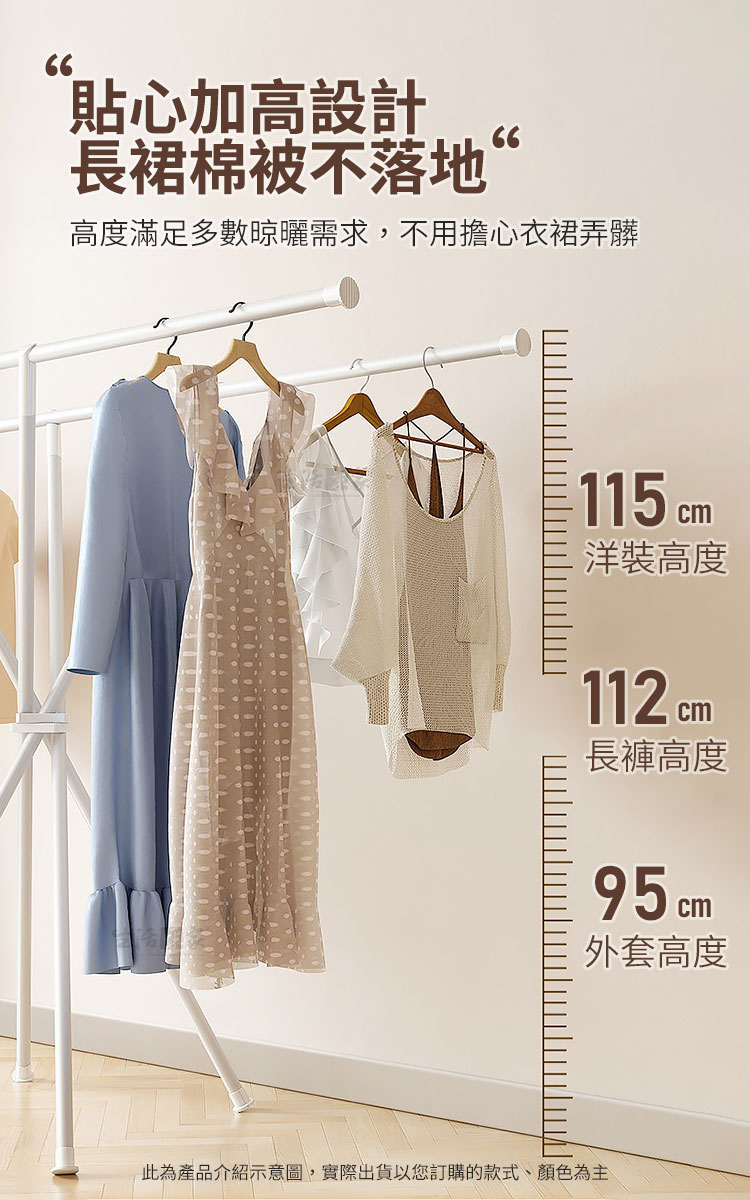 「開放設計」讓您可以自由取放衣物,加寬的桿距則讓不同衣物互不打擾,加高設計也有效防止衣物觸地,保持清潔衛生。👍👚