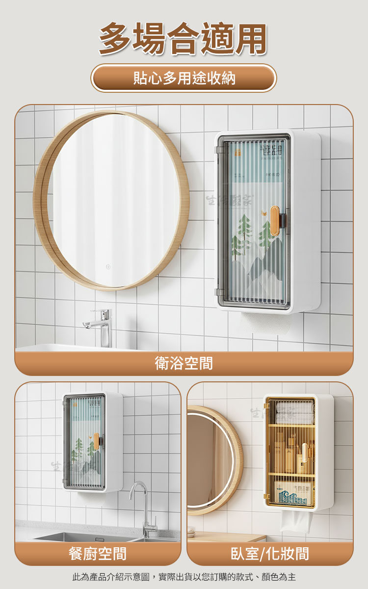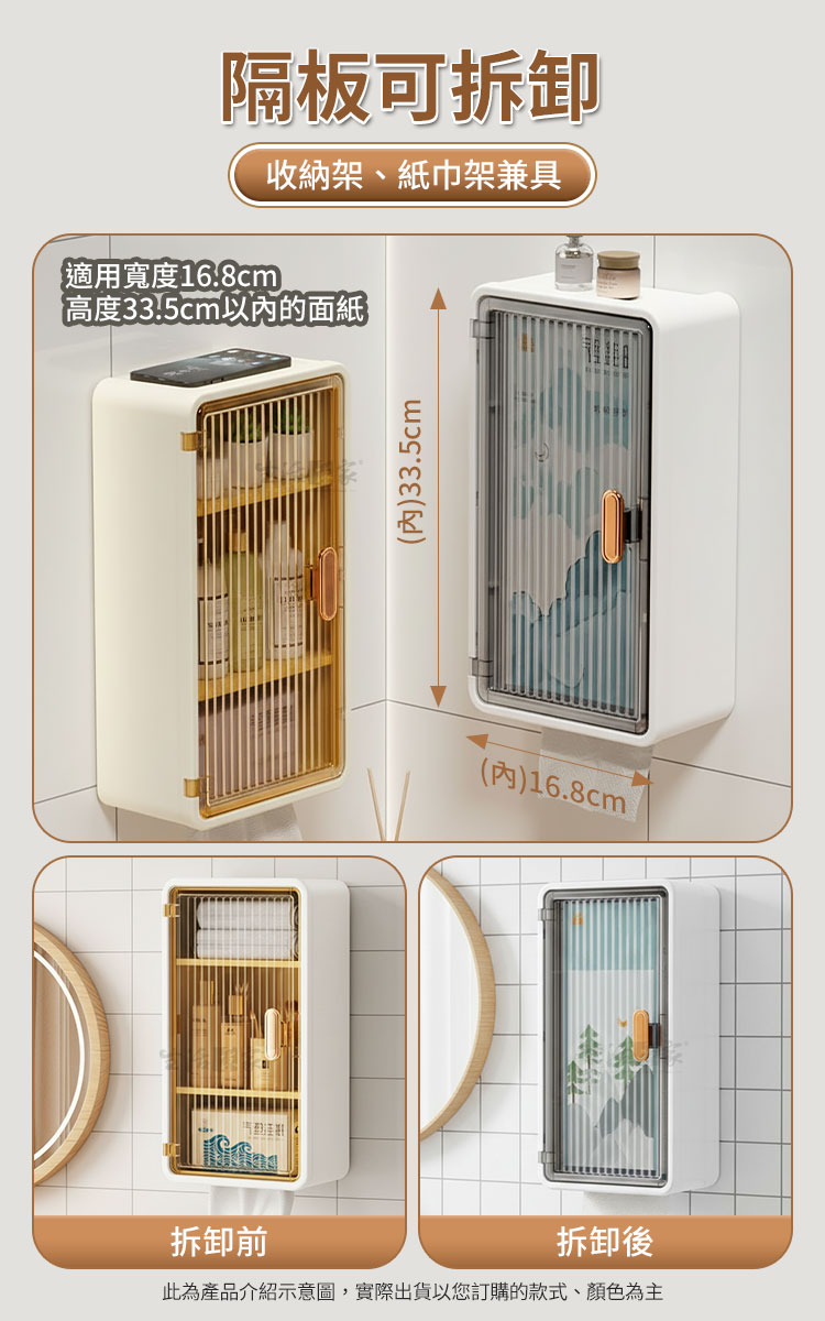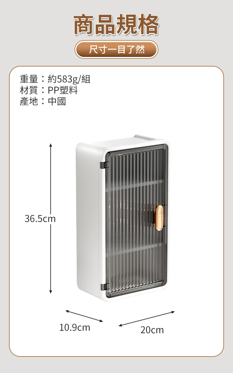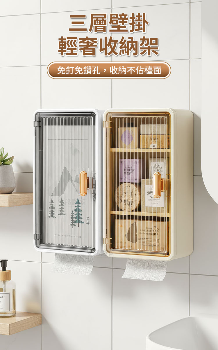 生活采家免打孔輕奢壁掛收納架|打造五星級飯店般的衛浴美學您是否也常為了浴室洗手檯面上堆滿的瓶瓶罐罐感到心煩?😵💫或是租屋處不能鑽孔,卻又苦無收納空間?😵💫生活采家為您帶來這款「輕奢壁掛防塵三層收納架」,這不只是一個置物盒,更是提升居家儀式感的秘密武器。👍採用北歐極簡設計語彙,結合獨特的長虹紋理半透明門板,讓您的私人保養品與日常雜物瞬間隱形,空間視覺感立即提升 100%!✨✅ 免打孔無痕安裝:採用強力背膠掛勾,單手即可完成安裝,不傷牆面,租屋族與愛房者的首選。✅ 三層置物分區:上層可放高瓶護膚水,中層放置乳液面霜,底層設有衛生紙/棉片抽屜,動線超順手。✅ 長虹紋磁吸門板:半透明質感若隱若現,保護隱私同時防塵防潑水,磁吸式開合設計,單手取物更優雅。✅ 頂部置物平台:架頂亦可放置擴香或綠植,每一吋空間都能發揮到極致。✅ 高品質 ABS 材質:耐用防水不生鏽,適應浴室潮濕環境,清潔保養超簡單。🛁使用後你會發現...原本雜亂的洗手台變得清爽乾淨,早晨梳化時心情不再焦慮。每一件物品都有專屬的位置,不僅拿取方便,更因為這款收納架的輕奢外觀,讓家裡的浴室瞬間擁有像飯店般的高級視覺感。🛒 牆面空間別浪費精緻生活不需大改裝,只需選對收納工具。現在就為您的居家環境升級,享受「生活采家」帶來的簡約美學吧!#居家收納 #免打孔置物架 #生活采家 #北歐風設計 #浴室美學📣 FAQ (常見問答)Q1:請問這款收納架可以承重多少?A1:搭配內附的專用無痕背膠,安裝於平整磁磚面後靜置 24 小時,可承載6kg的日常保養品與清潔用品重量。Q2:安裝時有什麼限制嗎?A2:請安裝於平整且光滑的表面,如瓷磚、玻璃、不鏽鋼等平面牆面,請避免安裝於粉刷牆或不平整壁紙上。Q3:門板是玻璃材質嗎?A3:門板採用高品質 PC/PP 材質,模擬長虹玻璃質感,既輕量又安全,非常適合浴室環境使用。Q4:裡面的隔板可以拆嗎?A:可以,圖片顯示隔板可拆卸,使用者可依需求調整收納空間。Q5:背膠拆卸後會留下痕跡嗎?A5:使用吹風機加熱背膠即可軟化撕除,不會在光滑牆面上留下殘膠。注意事項:1.安裝前請務必將牆面擦拭乾淨並保持乾燥,避免灰塵與水份影響背膠黏性。2.貼上掛勾後,請務必靜置 24 小時以上,再掛上主體及放置物品。3.不建議使用於水泥漆牆、壁紙或掉粉牆面,以免撕除時造成牆面脫落。4.請以軟布清水擦拭即可,避免使用強酸或強鹼化學藥劑清洗門板。5.請勿放置超過商品標示負荷之過重物品,或易碎精密貴重儀器。商品規格:1.尺寸:約寬20*深10.9*高36.5cm2.貼片尺寸:6.5*14cm3.材質:PP塑料4.重量:約583g/組5.產地:中國6.顏色:純白透黑6.商品:免打孔輕奢壁掛防塵三層收納置物架*1、貼片*2※商品為人工丈量略有誤差,請以實品為準。※網頁圖片因拍攝關係或螢幕設定不同而會與實際商品略有色差,請以實際收到商品為準。