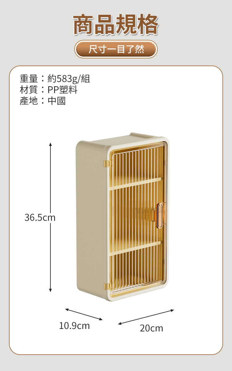 生活采家免打孔輕奢壁掛收納架|打造五星級飯店般的衛浴美學您是否也常為了浴室洗手檯面上堆滿的瓶瓶罐罐感到心煩?😵💫或是租屋處不能鑽孔,卻又苦無收納空間?😵💫生活采家為您帶來這款「輕奢壁掛防塵三層收納架」,這不只是一個置物盒,更是提升居家儀式感的秘密武器。👍採用北歐極簡設計語彙,結合獨特的長虹紋理半透明門板,讓您的私人保養品與日常雜物瞬間隱形,空間視覺感立即提升 100%!✨✅ 免打孔無痕安裝:採用強力背膠掛勾,單手即可完成安裝,不傷牆面,租屋族與愛房者的首選。✅ 三層置物分區:上層可放高瓶護膚水,中層放置乳液面霜,底層設有衛生紙/棉片抽屜,動線超順手。✅ 長虹紋磁吸門板:半透明質感若隱若現,保護隱私同時防塵防潑水,磁吸式開合設計,單手取物更優雅。✅ 頂部置物平台:架頂亦可放置擴香或綠植,每一吋空間都能發揮到極致。✅ 高品質 ABS 材質:耐用防水不生鏽,適應浴室潮濕環境,清潔保養超簡單。🛁使用後你會發現...原本雜亂的洗手台變得清爽乾淨,早晨梳化時心情不再焦慮。每一件物品都有專屬的位置,不僅拿取方便,更因為這款收納架的輕奢外觀,讓家裡的浴室瞬間擁有像飯店般的高級視覺感。🛒 牆面空間別浪費精緻生活不需大改裝,只需選對收納工具。現在就為您的居家環境升級,享受「生活采家」帶來的簡約美學吧!#居家收納 #免打孔置物架 #生活采家 #北歐風設計 #浴室美學📣 FAQ (常見問答)Q1:請問這款收納架可以承重多少?A1:搭配內附的專用無痕背膠,安裝於平整磁磚面後靜置 24 小時,可承載6kg的日常保養品與清潔用品重量。Q2:安裝時有什麼限制嗎?A2:請安裝於平整且光滑的表面,如瓷磚、玻璃、不鏽鋼等平面牆面,請避免安裝於粉刷牆或不平整壁紙上。Q3:門板是玻璃材質嗎?A3:門板採用高品質 PC/PP 材質,模擬長虹玻璃質感,既輕量又安全,非常適合浴室環境使用。Q4:裡面的隔板可以拆嗎?A:可以,圖片顯示隔板可拆卸,使用者可依需求調整收納空間。Q5:背膠拆卸後會留下痕跡嗎?A5:使用吹風機加熱背膠即可軟化撕除,不會在光滑牆面上留下殘膠。注意事項:1.安裝前請務必將牆面擦拭乾淨並保持乾燥,避免灰塵與水份影響背膠黏性。2.貼上掛勾後,請務必靜置 24 小時以上,再掛上主體及放置物品。3.不建議使用於水泥漆牆、壁紙或掉粉牆面,以免撕除時造成牆面脫落。4.請以軟布清水擦拭即可,避免使用強酸或強鹼化學藥劑清洗門板。5.請勿放置超過商品標示負荷之過重物品,或易碎精密貴重儀器。商品規格:1.尺寸:約寬20*深10.9*高36.5cm2.貼片尺寸:6.5*14cm3.材質:PP塑料4.重量:約583g/組5.產地:中國6.顏色:奶白透茶6.商品:免打孔輕奢壁掛防塵三層收納置物架*1、貼片*2※商品為人工丈量略有誤差,請以實品為準。※網頁圖片因拍攝關係或螢幕設定不同而會與實際商品略有色差,請以實際收到商品為準。
