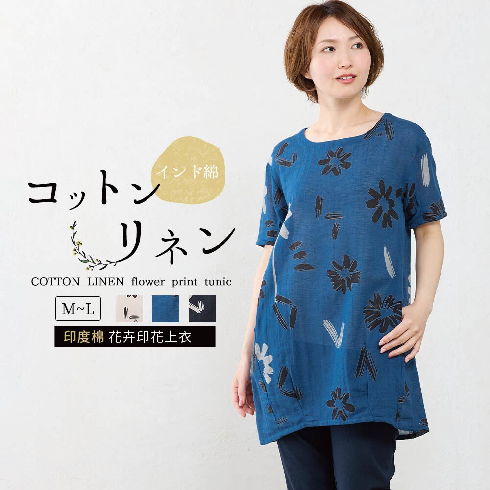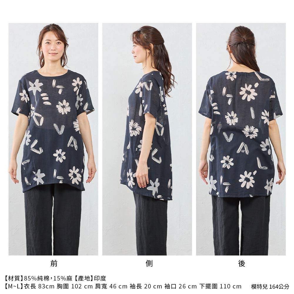 日本【SHONAGON】印度棉花卉印花上衣涼やかで優しい風合い。綿麻/SPANオリジナル・プリントチュニック後ろゴムで楽々着脱インドのさらっと快適なコットンリネン素材を使用した総柄プリントのチュニック。目を惹くプリントでシンプルになりがちな春夏のコーデに華やぎをプラスして カジュアルにも上品スタイルにもこなせ、 ゆったりシルエットと5分袖で体型カバーにも使えるアイテムです。這款束腰外衣採用來自印度的柔滑舒適棉麻布料,印滿印花圖案,清涼柔和的質感。醒目的印花為偏向簡約的春夏裝束增添一抹魅力。它既可搭配休閒風格,又可搭配優雅風格。寬鬆的輪廓和5/8袖的設計也有助於修飾身材。【材質】85%純棉,15%麻【M~L】衣長 83cm胸圍 102 cm肩寬 46 cm袖長 20 cm袖口 26 cm下擺圍 110 cm【產地】印度SNG-12308274IM 象牙白 M-LSNG-12308274NM 深藍 M-LSNG-12308274BM 黑 M-L