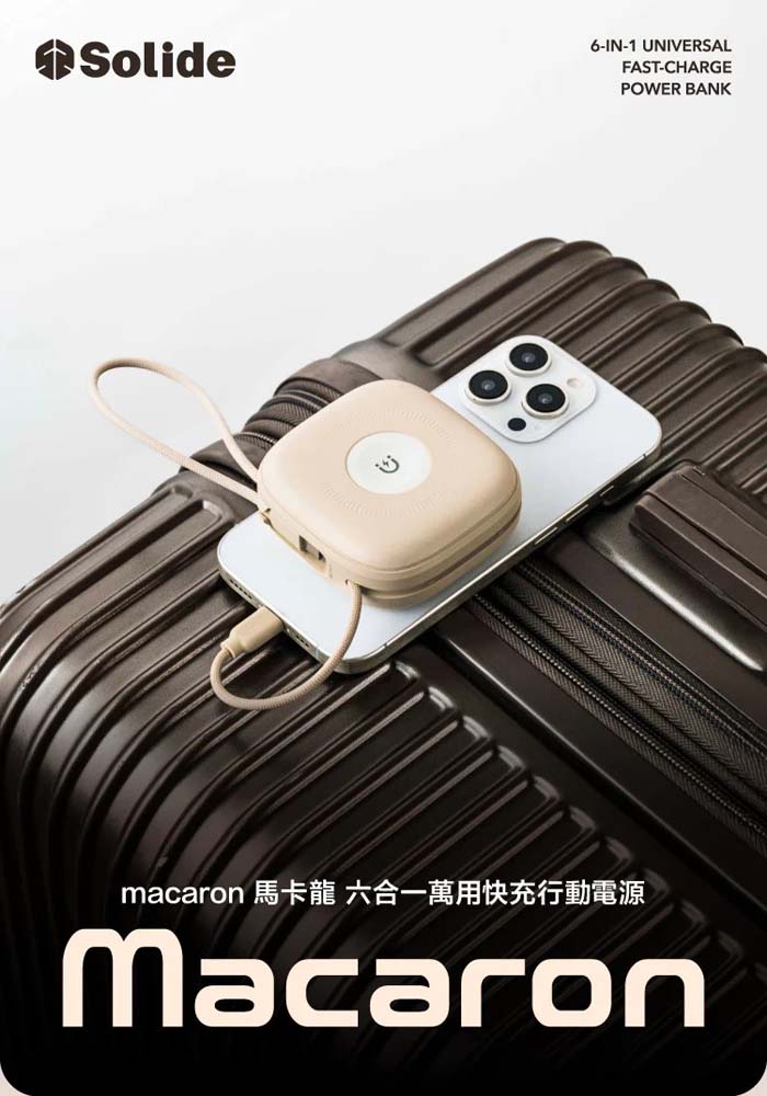 【產品規格】Macaron 馬卡龍 10000mAh 六合一萬用快充– 品牌:solide 索力得-型號:W1185C– 額定規格:Type-C 接口輸入:5V⎓3.0A/9V⎓2.0A/12V⎓1.5AType-C 接口輸出:5V⎓3.0A/9V⎓2.22A/12V⎓1.67AType-C 線1輸入:5V⎓3.0A/9V⎓2.0A/12V⎓1.5AType-C 線1輸出:5V⎓3.0A/9V⎓2.22A/12V⎓1.67AType-C 線2輸出:5V⎓3.0A/9V⎓2.22A/12V⎓1.67A手機 / 耳機無線充輸出:支持 5W/7.5W/10W/15W手錶無線充輸出:2.5WType-C 接口+Type-C 線 1 +Type-C 線 2 +無線充電總輸出:5V⎓3.0A輸出功率:20W電池能量:38.5Wh額定容量:5V/6500mAh,9V/3500mAh,12V/2500mAh– 電芯及組合方式:聚合物電池 / 115252 / 2片– 輸出介面:Type-C 接口 / Type-C 線 1 / Type-C 線 2 輸出– 尺寸:75.1 x 72.1 x 29.9 mm– 重量:205g + 5g– 材質:PC、ABS、電子元件– 內容物:機器、收納袋、說明書