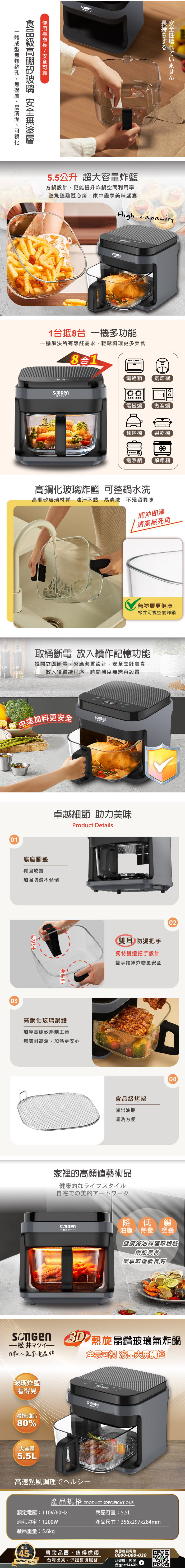 【SONGEN松井】日系3D熱旋5.5L晶鑽玻璃氣炸鍋/烘烤爐/氣炸烤箱(SG-421GAF(B))