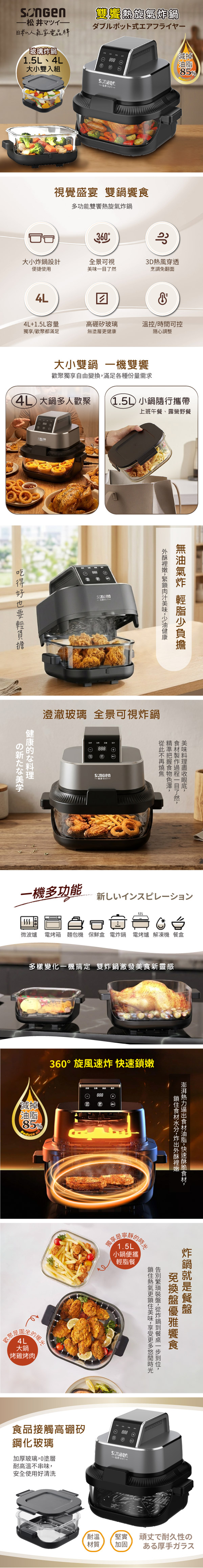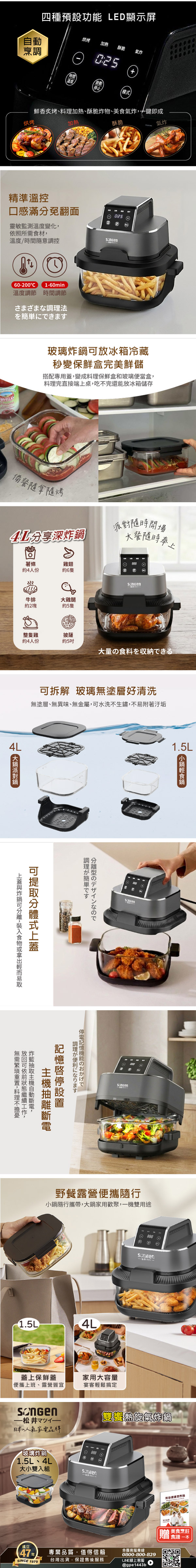 3D全方位熱旋循環、免油香酥脆大小雙鍋、家庭聚會或便攜上班野餐預設四種自動烹調功能、容易操作全景透明玻璃炸鍋、烘烤一目瞭然可提取分體式上蓋、方便取拿食物取鍋自動斷電、烹調安全放心