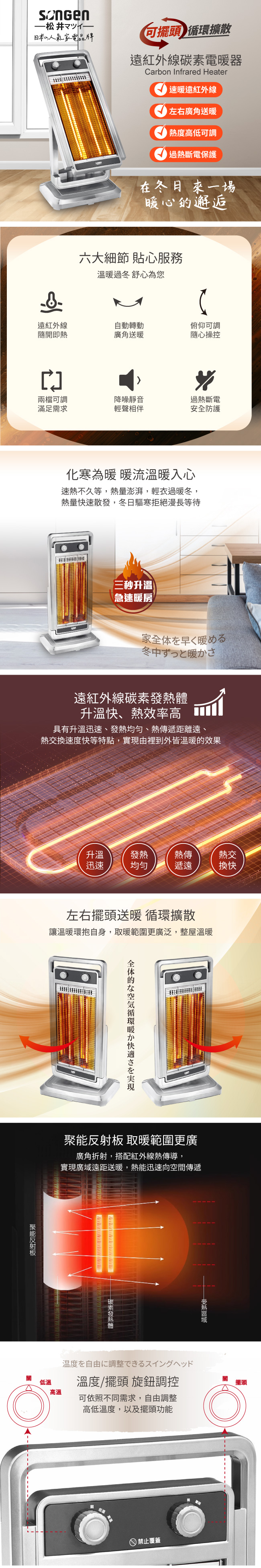 遠紅外線發熱,迅速制暖快速驅寒俯仰角度立體送暖,大範圍取暖可自動左右擺頭,廣角送暖兩段式調節溫控,方便易操作聚能反射罩,節能熱效率高超溫自動斷電,傾倒斷電裝置