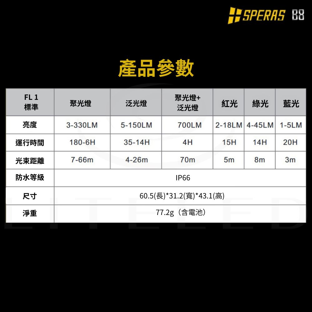 最大輸出:700流明最大光束距離:70米使用電池:內建1800mAh電池光源:RGB LED,紅光/藍光/綠光產品尺寸:60.5 (長)* 31.2 (寬)* 43.1 (高) mm產品重量:77.2g (含電池)防護等級:IP66特色:一鍵進入Turbo 模式 / 記憶模式