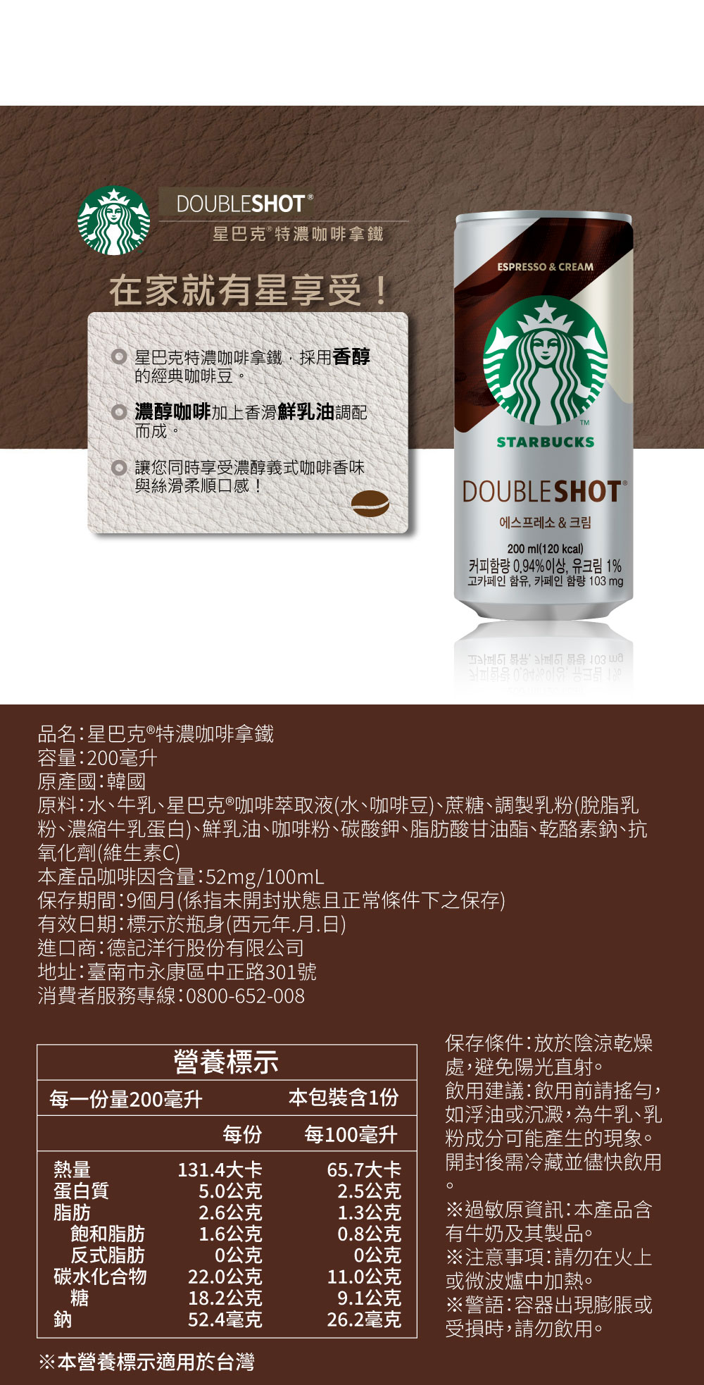原料:水、牛乳、星巴克咖啡萃取液、蔗糖、調製乳粉、鮮乳油、咖啡粉等