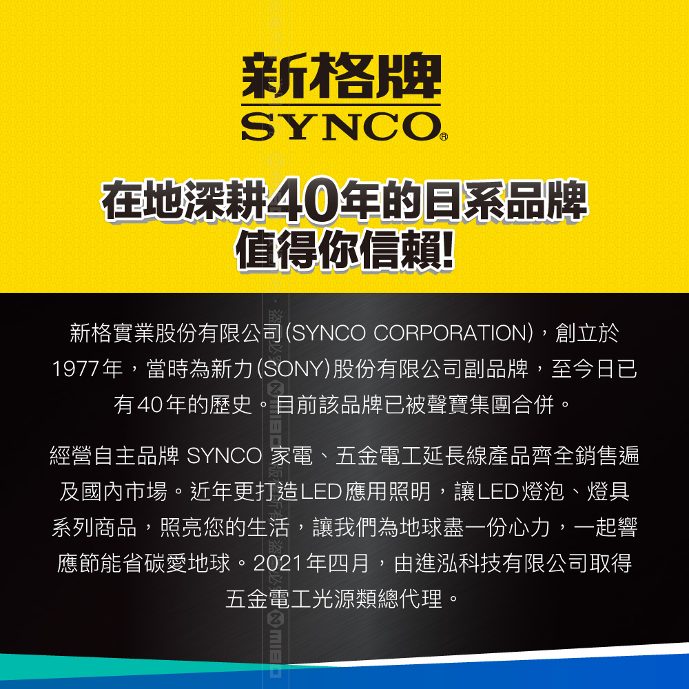 👍SYNCO新格牌是台灣在地經營40年的日系品牌,本公司是聲寶授權光源/電工類總代理。