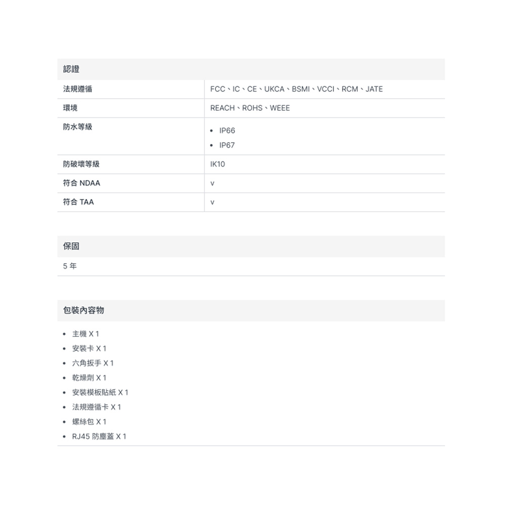 戶外專用攝影機,具備 IP66/67 與 IK10 等級,可防塵、防雨與防撞擊