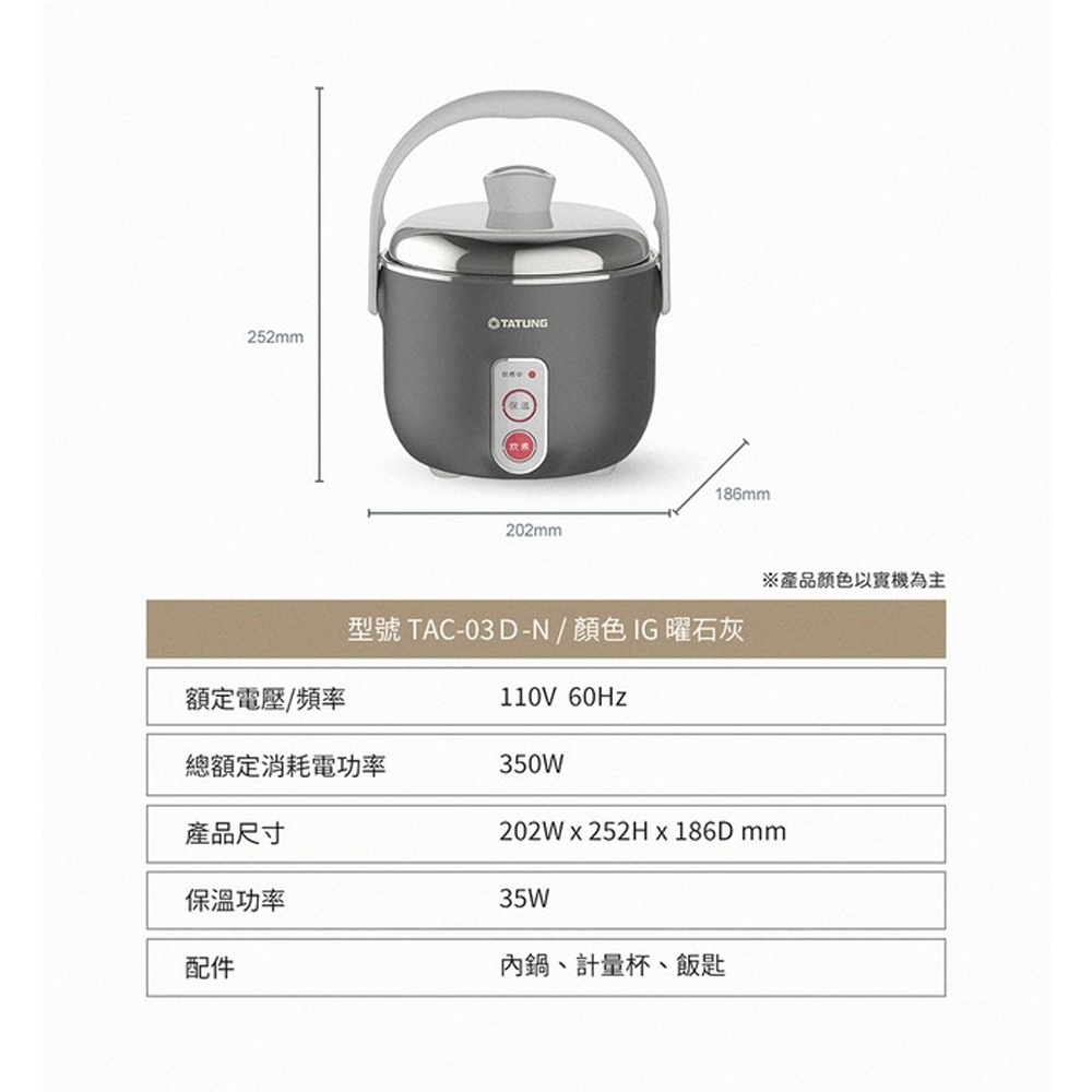 ◆消費權益◆■ 鑑賞期並非"試用期"。■ 退貨商品需是「全新商品」且「包裝完整」,包括外箱、包材、贈品等原廠所有配件,缺件、刮傷皆不同意退換貨。■ 大型家電一經拆箱定位安裝、插電及使用後,除原廠鑑定為商品問題外,不得以其他個人理由退換貨。■ 商品簽收前請務必確認商品型號、顏色正確,一經簽收即代表同意,不得以其他個人理由退換貨。■ 對商品有疑慮的地方請務必先詢問,能接受再訂購!■ 商品送達後若因買家因素無法安裝或拒收,買家需負擔賣家出貨產生的物流費用商品特色:3人份電鍋,曜石灰外殼內外鍋均為SUS 304 不鏽鋼加熱均勻,自動保溫雙重被覆電源線,雙重安全保護煮飯/粥、蒸、滷、燉多用途外型小巧方便商品規格:型號:TAC-03D-NIG容量:3人份電壓:110V /60Hz商品尺寸:202 * 252 * 186 mm產品重量:2.6kg內鍋材質:304不鏽鋼配件:內鍋、量米杯、飯匙消耗功率:350W產地:台灣保固:1年BSMI:R31001貨源:公司貨注意事項:此機型有保溫開關,電源線與主體為分離式本商品資訊由網路及官網收集彙整而成,僅供參考,如有更新或異動不另外通知,正確商品資訊及規格以實機為準。鑑賞期非試用期,產品一經拆箱、插電及使用皆會影響您退貨權利。
