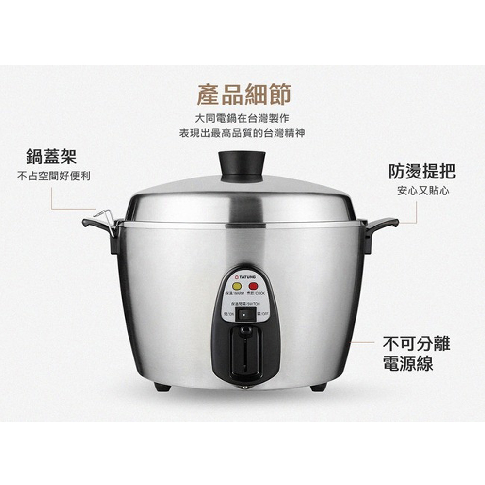 ◆消費權益◆■ 鑑賞期並非"試用期"。■ 退貨商品需是「全新商品」且「包裝完整」,包括外箱、包材、贈品等原廠所有配件,缺件、刮傷皆不同意退換貨。■ 大型家電一經拆箱定位安裝、插電及使用後,除原廠鑑定為商品問題外,不得以其他個人理由退換貨。■ 商品簽收前請務必確認商品型號、顏色正確,一經簽收即代表同意,不得以其他個人理由退換貨。■ 對商品有疑慮的地方請務必先詢問,能接受再訂購!■ 商品送達後若因買家因素無法安裝或拒收,買家需負擔賣家出貨產生的物流費用商品特色:220V 異電壓(僅國外適用)具保溫切換開關,免拔插頭雙重被覆電源線,雙重安全保護煮飯/粥、蒸、滷、燉多用途全鍋採用食品級304不鏽鋼材質台灣製造商品規格:型號:TAC-11T-MMV2容量:11人份電壓:220V內鍋材質:304不鏽鋼商品尺寸(材積):高270 * 寬350 * 深300 mm產品重量:4.2 kg消耗功率:700W配件:內鍋、內鍋蓋、蒸盤、量米杯、飯匙產地:台灣保固:1年BSMI:R31001貨源:公司貨※請注意:異電壓電鍋“僅符合當地電壓使用,請自行另購買當地的轉換插頭使用”※異電壓商品保固、維修、退貨相關辦法僅限於台灣本島不適用國外※本商品資訊由網路及官網收集彙整而成,僅供參考,如有更新或異動不另外通知,正確商品資訊及規格以實機為準。鑑賞期非試用期,產品一經使用皆會影響您退貨權利。