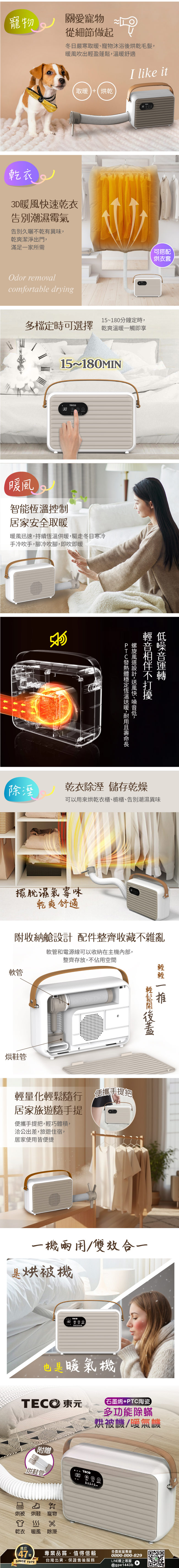 品 牌:TECO東元型 號:XYFYQ002額定電壓及額定頻率:110V/60Hz總額定消耗電功率:450W商品尺寸:360(寬)x120(深)x225(高)mm商品重量:2.3kg配 件:雙風道烘鞋管*1產品保證:明台產物保險2000萬產品責任險製造沿革:47年電器專業製造,保證售後服務