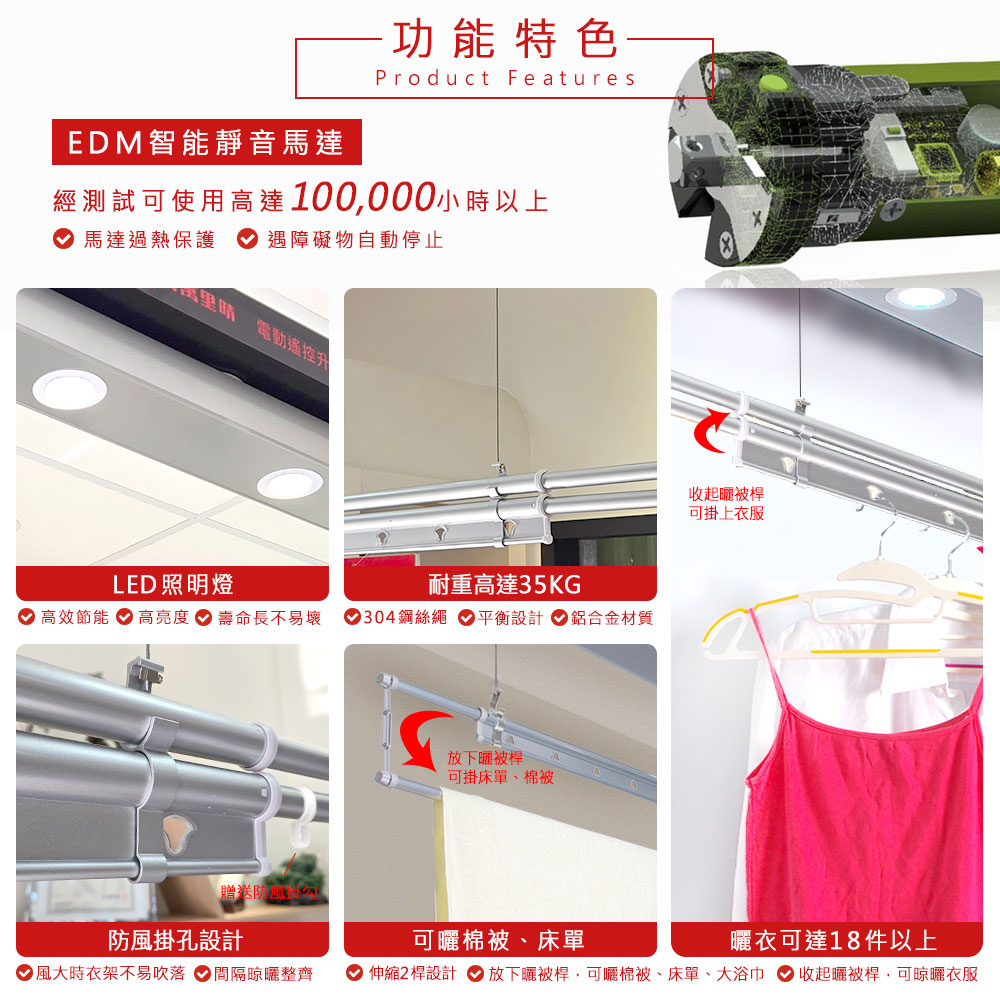 ◆EDM智能靜音馬達科技,下降遇障礙物將自動停止、電機過熱保護等安全裝置,馬達經測試可使用高達100000小時以上,運行安靜穩定且安全。