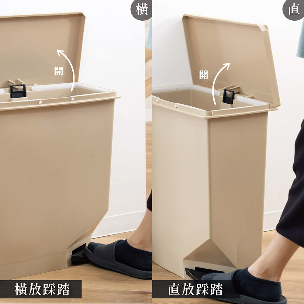 踏板是設計在主體的一個角落,因此您可以將其垂直或水平放置隨意更改放置位置且無需擔心踏板的位置簡單而纖薄的設計非常適合擺放於家中和廚房內蓋子側向打開且不高(總高74公分),因此直接放在櫃檯下面也是很合適的尺寸;大約寬45x深25x高53cm(當蓋子完全打開時:高度約74cm)容量:35L材質:聚丙烯原產國:日本