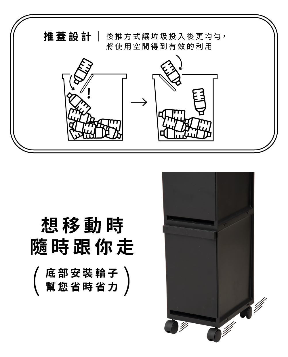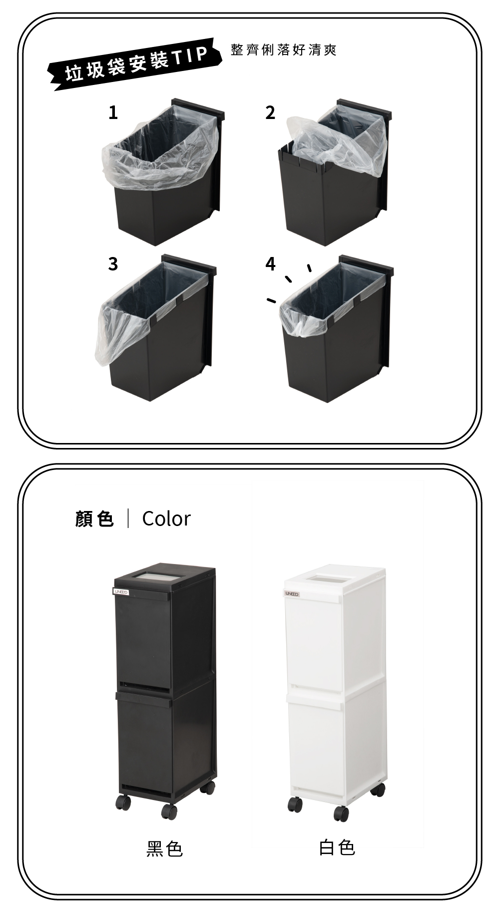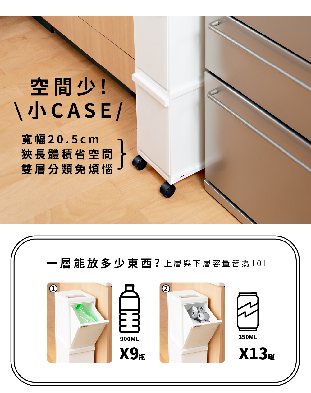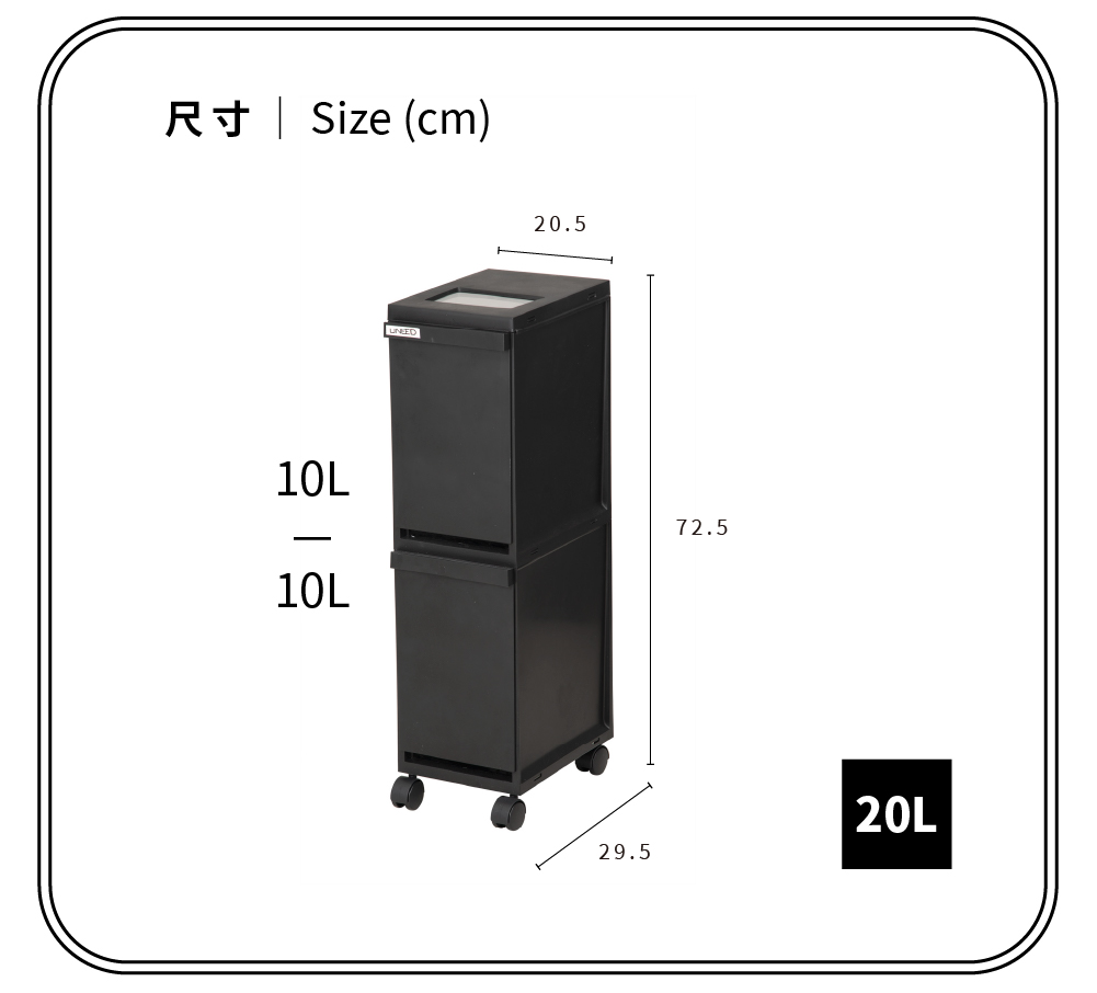 寬度僅有20.5公分,因此放置在櫃與櫃之間是一個聰明的選擇雙層空間方便您收納(分類)不一樣的物品上下兩層都能像抽屜一樣的打開且附有輪子讓您可以方便任意移動尺寸:29.5×20.5×高度72.5 cm材質:本體-PP、輪子-PP、PC、鋼容量:20L(上段約10公升+下段約10公升)重量:2.535Kg耐重:每層約1.5kg(較重的物品建議放下層)原產地:日本