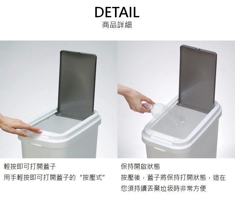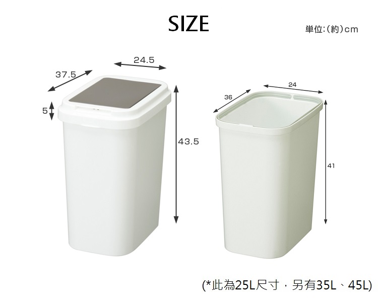 白色的外觀加上輕按即可打開蓋子 是一個非常方便又實用的垃圾收納桶內有垃圾袋設置環可固定垃圾袋尺寸:約 寬37.5x深24.5x高43.5cm材質:聚丙烯容量:約 25公升重量:約 0.96公斤生產國:日本