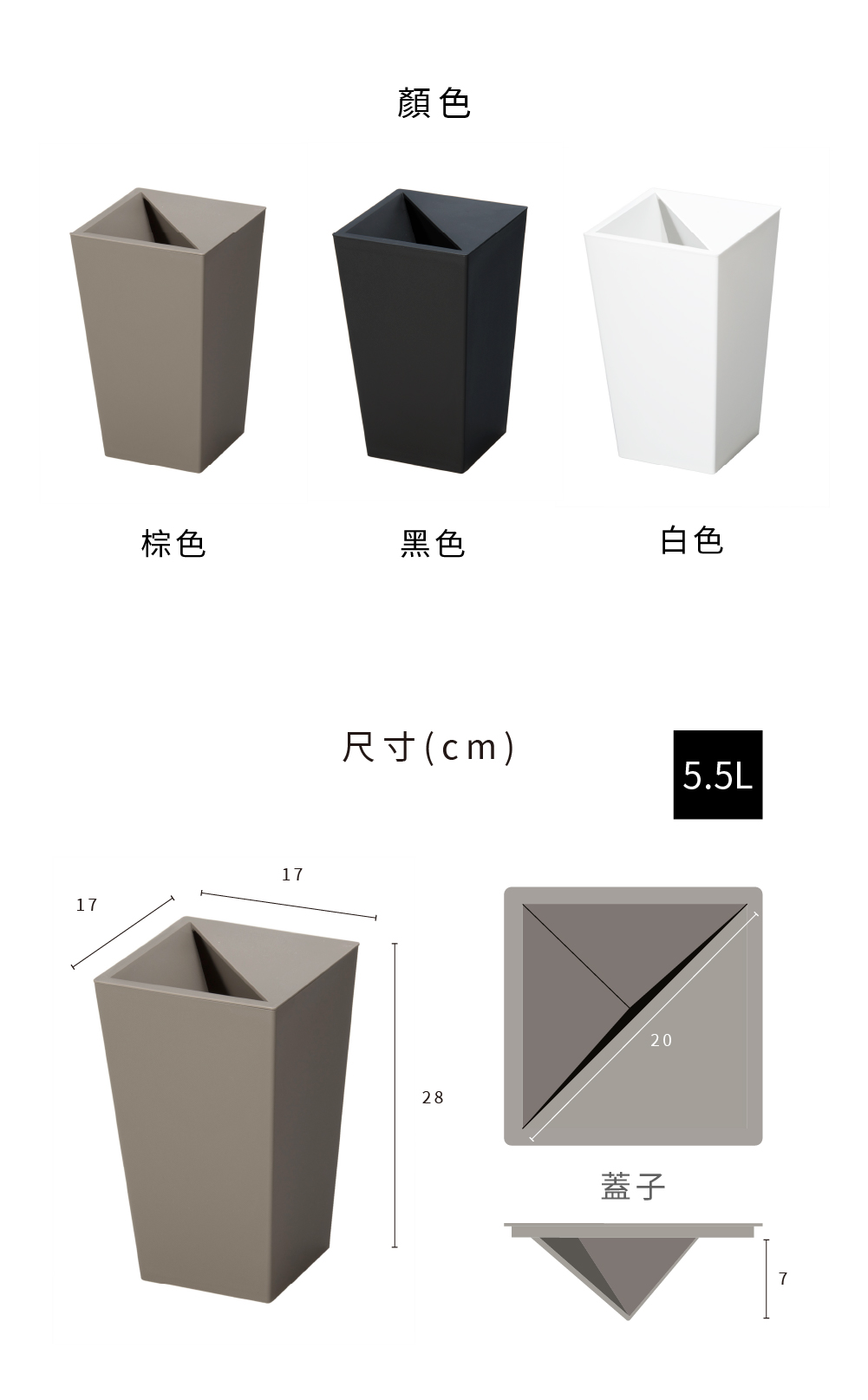 半開口設計,擁有高方便性及隱密性上蓋為斜角設計,讓您從頂部也看不到垃圾將輕巧的上蓋打開後,亦可丟棄較大型垃圾尺寸:17×17×高度28 cm材質:PP容量:5.5L重量:0.375Kg原產地:日本