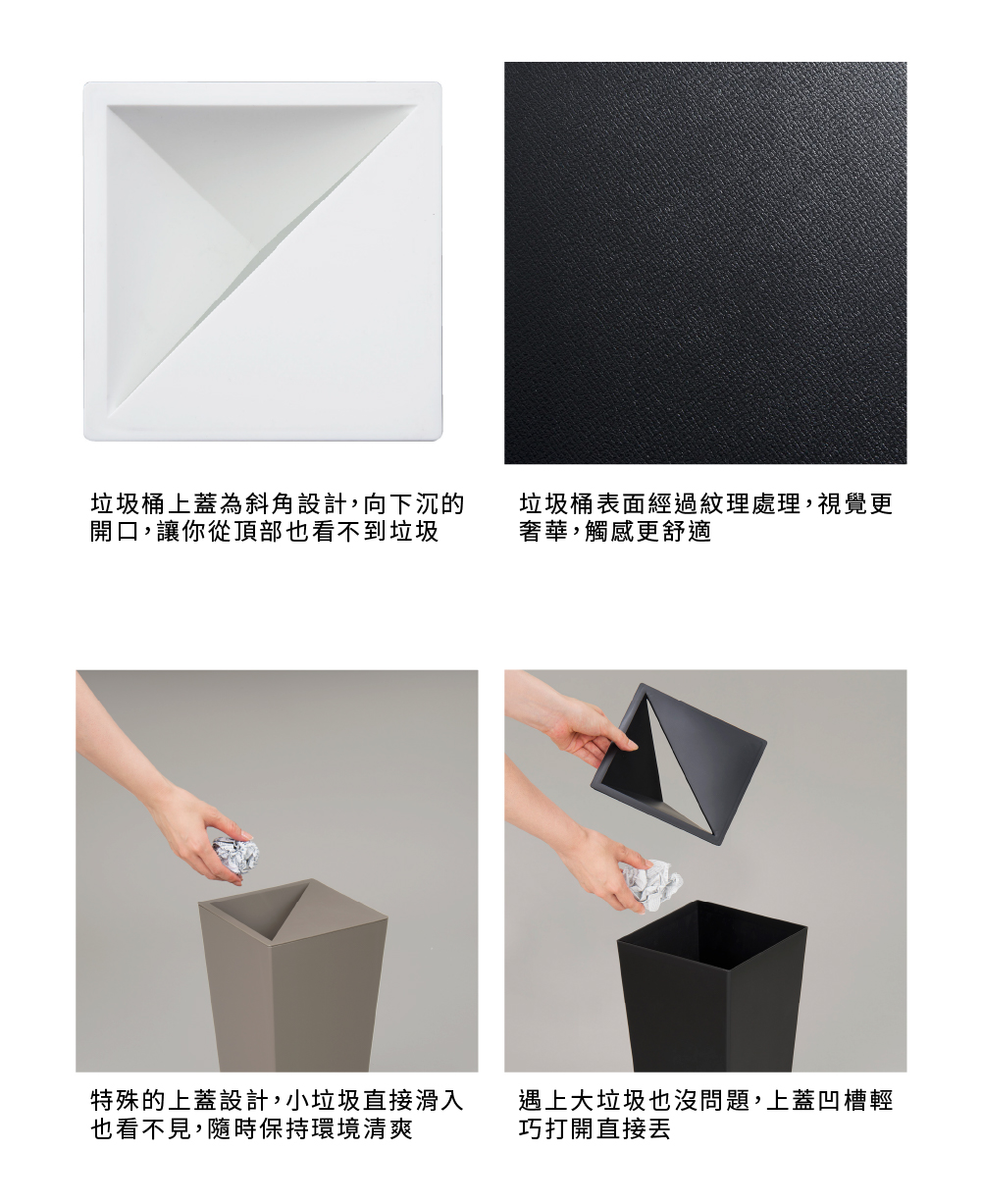 半開口設計,擁有高方便性及隱密性上蓋為斜角設計,讓您從頂部也看不到垃圾將輕巧的上蓋打開後,亦可丟棄較大型垃圾尺寸:19×19×高度36 cm材質:PP容量:9L重量:0.521Kg原產地:日本