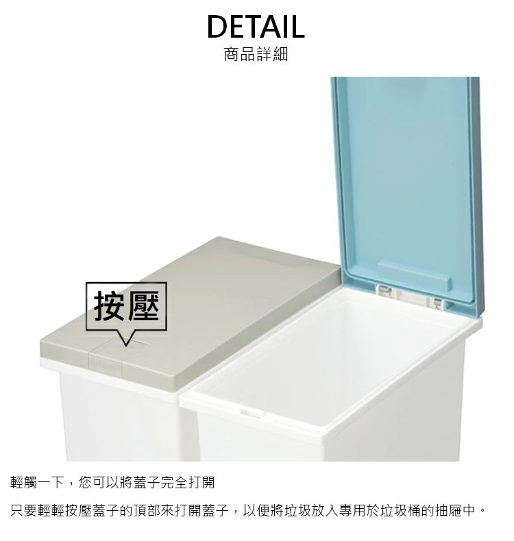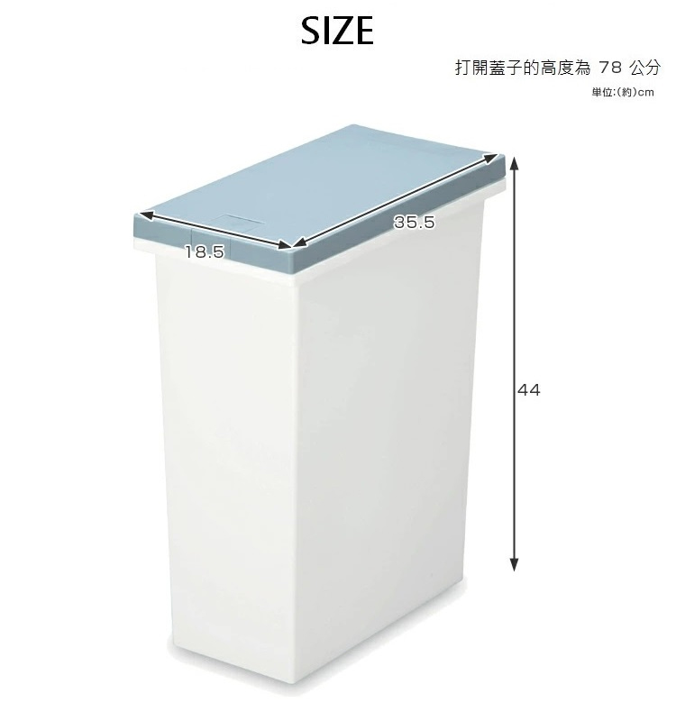 單手按壓的上蓋式垃圾桶 以簡單自然的顏色 呈現不一樣的美感 可自由的購入喜愛的顏色做搭配並依喜好擺設 纖細的容量,在狹窄的地方也能輕使用尺寸:約 寬18.5x深35.5x高44cm(打開蓋子後高度為78公分)材質:聚丙烯容量:約 20公升重量:約 0.9公斤生產國:日本