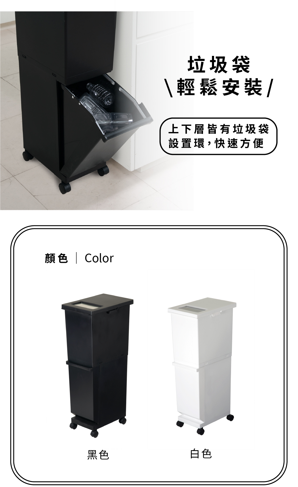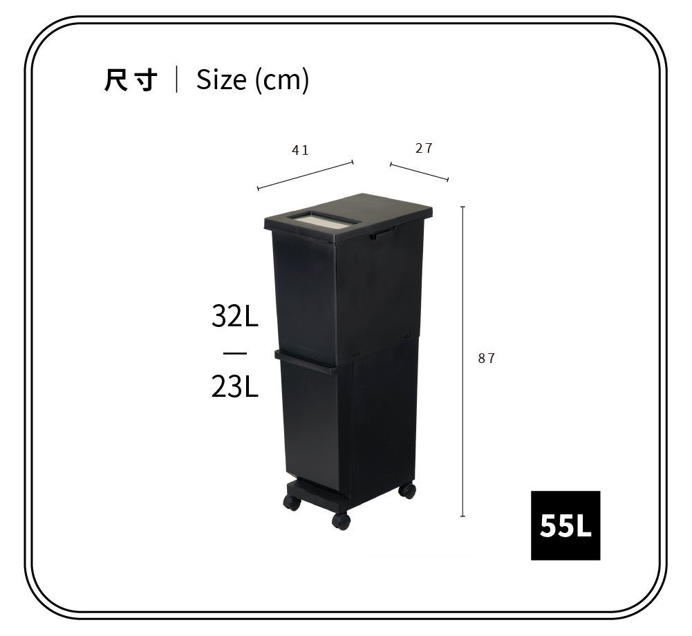 寬度僅有27公分,因此放置在櫃與櫃之間是一個聰明的選擇除了雙層空間方便您收納(分類)不一樣的物品在左右兩側還有掛勾可以吊掛收納喔,一秒變成4種分類且附有輪子讓您可以方便任意移動尺寸:41×27×高度87 cm扣掉輪子後的尺寸:41×27×高度82.2 cm材質:本體-PP、輪子-PP、PC、鋼容量:55L(上段約32公升+下段約23公升)重量:3.26Kg耐重:約20kg(較重的物品建議放下層)原產地:日本