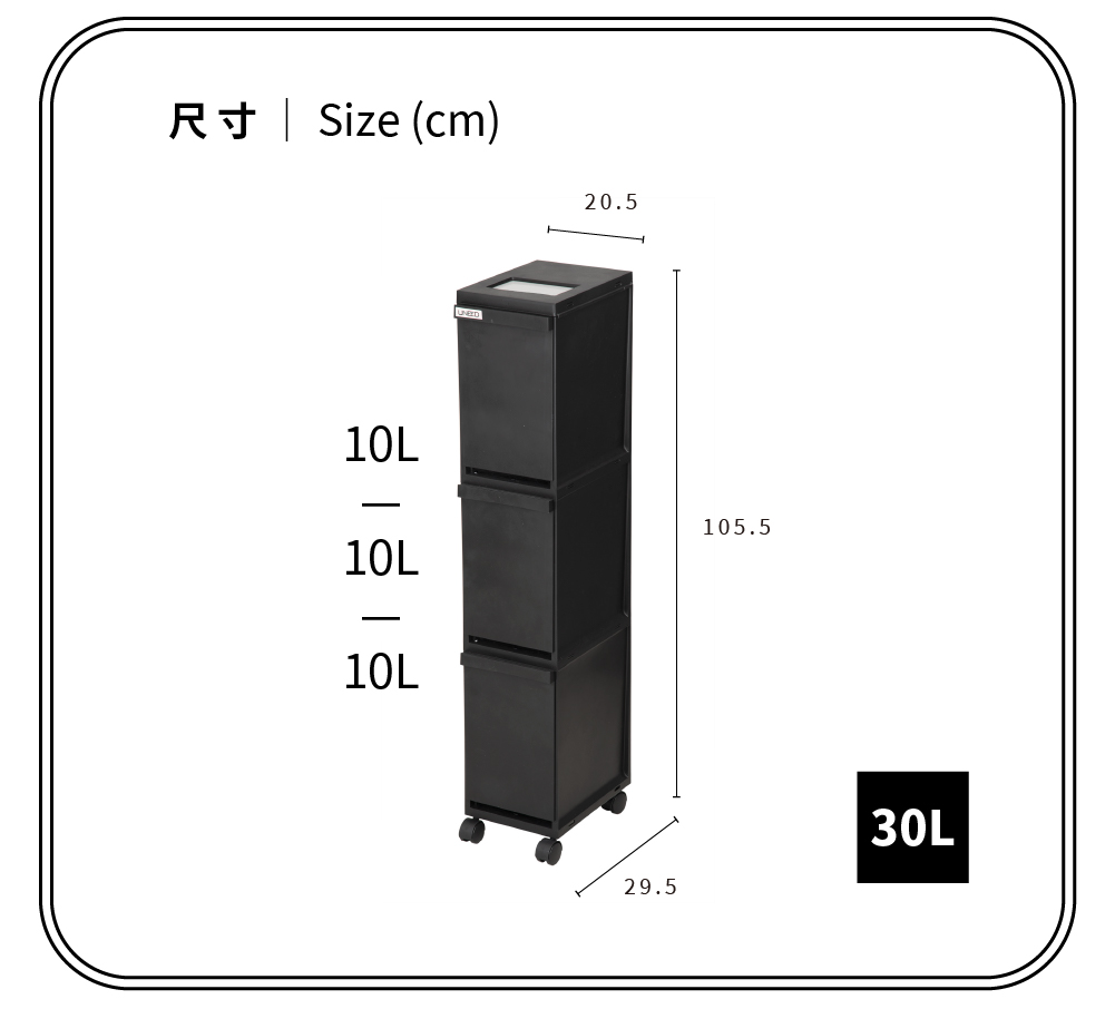 寬度僅有20.5公分,因此放置在櫃與櫃之間是一個聰明的選擇三層空間方便您收納(分類)不一樣的物品上下兩層都能像抽屜一樣的打開且附有輪子讓您可以方便任意移動尺寸:29.5×20.5×高度105.5 cm材質:本體-PP、輪子-PP、PC、鋼容量:30L(上段約10公升+中段約10公升+下段約10公升)重量:3.675Kg耐重:約1.5kg(較重的物品建議放下層)原產地:日本