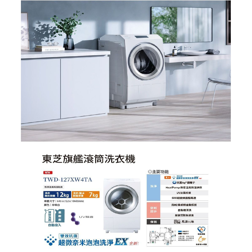 TOSHIBA東芝12公斤熱泵UV超微奈米泡溫水自動投劑洗脫烘滾筒洗衣機 TWD-127XW4TA