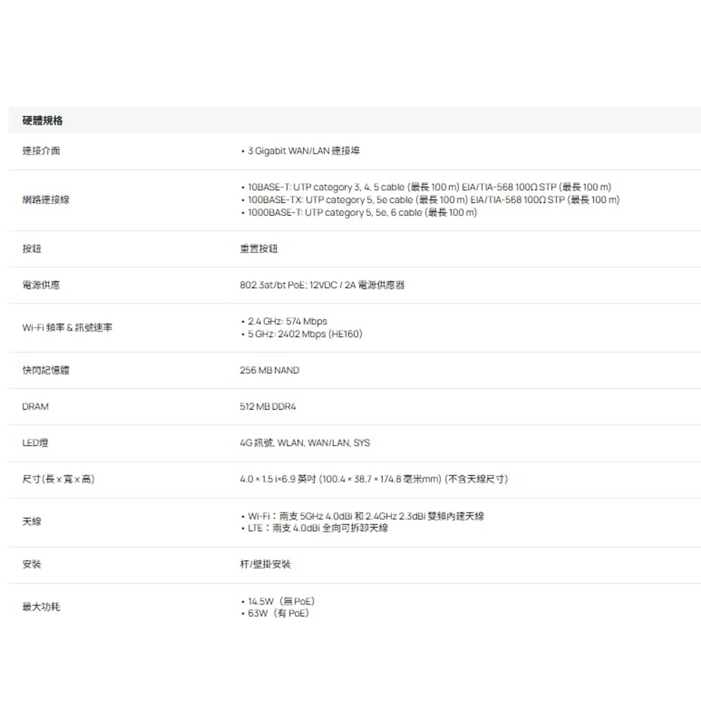 • 3 × Gigabit WAN/LAN 連接埠 (2 × PoE 輸出, 1 × PoE 輸入)