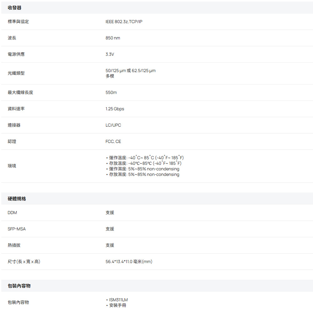 ISM311LM 是一款工業級 SFP 模組,是為了延長傳輸距離而推出的。安裝於我們的工業級交換器中,距離可以延長至 550 公尺。使用者可根據具體需求選擇光纖模組來做使用。