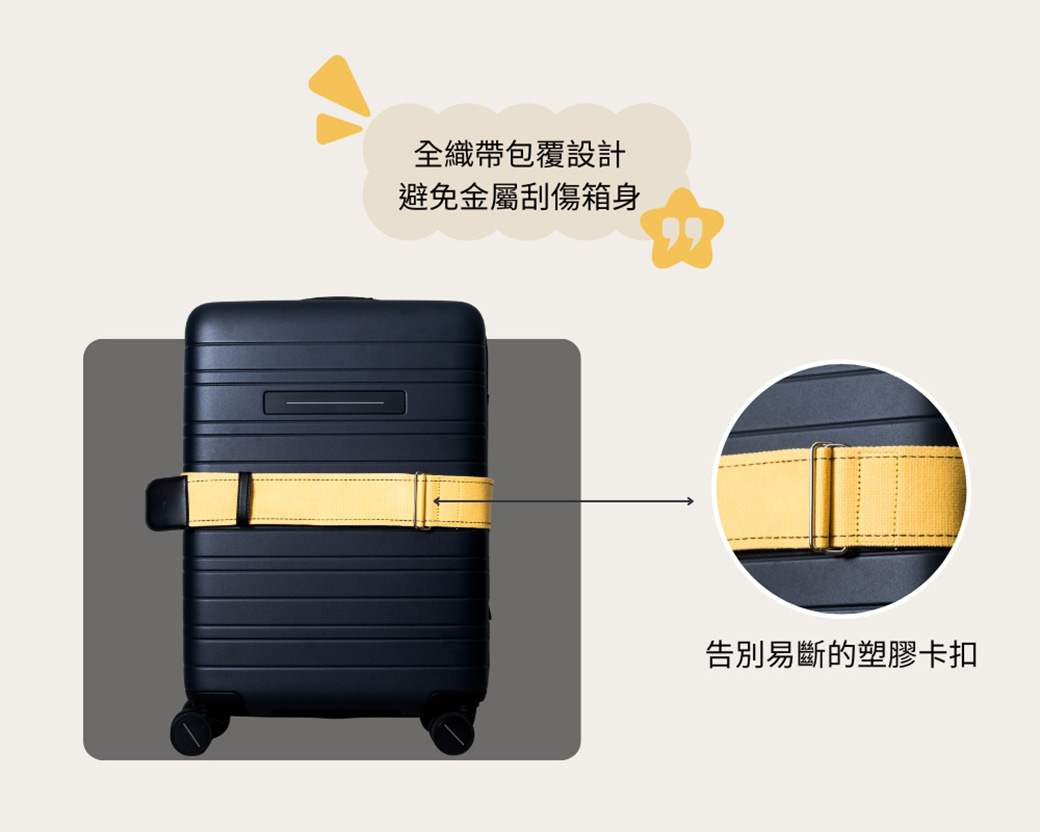 高密度棉質織帶:採用高密度編織技術,堅韌卻不粗糙。相較於一般尼龍帶,棉質觸感更加親膚且防滑,為您的行李提供穩定的束縛力。全真皮收邊工法:束帶末端與連接處均採用真皮(牛皮)手工收邊,不僅大幅提升整體質感,更能有效防止織帶虛邊,耐用度提升數倍。金屬調節環設計:選用高品質金屬調節環,解決塑料扣環容易脆化、斷裂的問題。全織帶包覆設計,聰明避開金屬直接接觸箱體,保護您的行李箱不被刮傷。