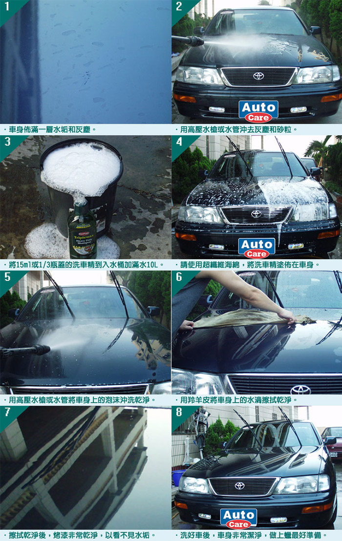 您還在用洗衣粉、洗碗精洗車嗎?因其中含有的氯化鈉成分會侵蝕車身漆層、蠟膜和橡膠件,使烤漆失去光澤、橡膠零件老化。洗衣粉的顆粒很難溶解 ,可能會刮傷烤漆,洗完後難沖、並會留下水痕。還在使用洗衣粉、洗碗精、家庭洗滌劑清洗汽車嗎?!請馬上停止這樣的舉動,它們包含強鹼和鹽有可能會洗掉現有車身上所有的蠟和將烤漆弄黯淡無光。‧ 特殊清潔劑,可有效去除道路灰塵、油脂、頑固污垢和泥土的所有痕跡,而不會損壞漆面。‧ 超豐富泡沫輕鬆洗淨深層污垢,清洗後不留水痕,為上蠟處理而準備。‧ 洗淨後為保持持久的光澤,請上蠟處理。‧ 可生物分解的超濃縮配方,不僅絕不損傷車漆。