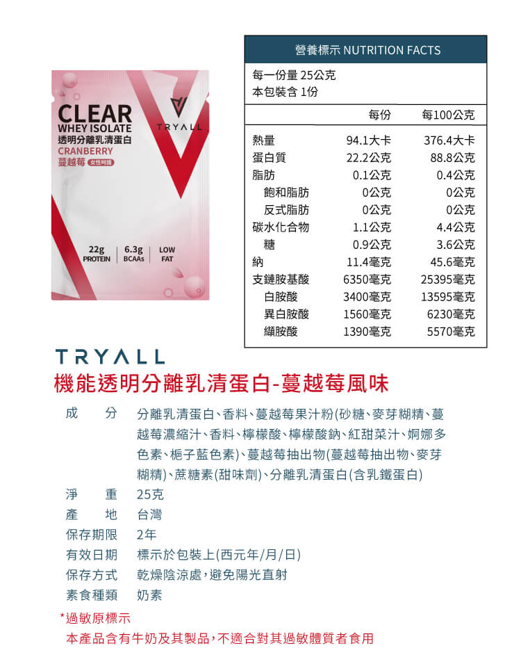 [饌元]Tryall 機能透明分離乳清10入-蔓越莓25g