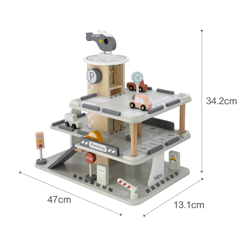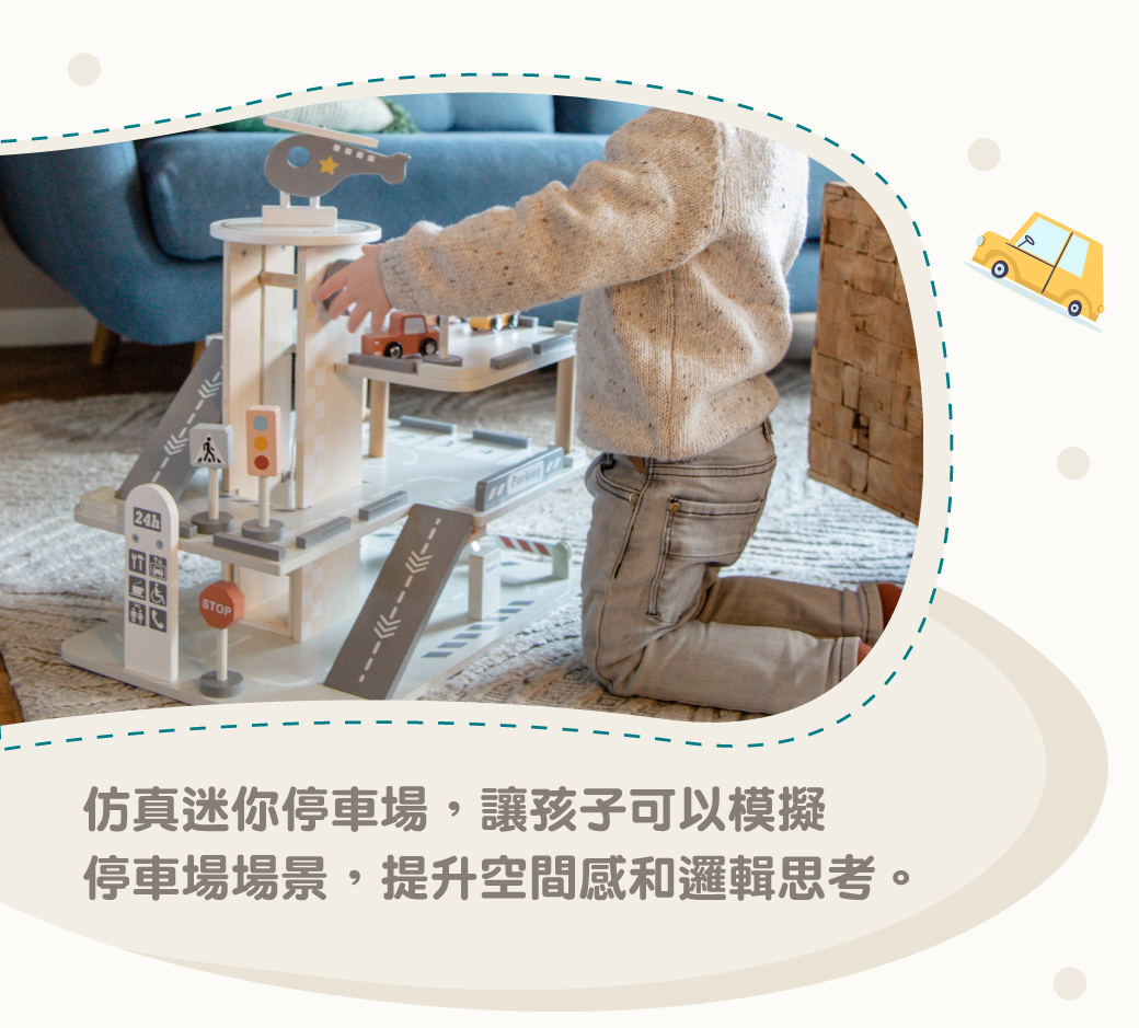 尺寸:45x30x37cm重量:3700g材質:中密度纖維板(MDF)、木頭、膠合板產地:中國●附有四輛汽車、四個路標告示牌、一架直升機、一處洗車場、一處充電站、一座起重機●三層樓的停車場和多個停車位,包含直行道、彎曲道路、起重機等設計,讓孩子可以模擬停車場場景,提升空間感和邏輯思考●柵欄上升,車輛依序進入停車場,依照路標告示牌行駛●直升機出勤任務回來後,可停靠在最上方的直升機停機坪●起重機可將故障車輛緩緩拉起至最高樓層●學習主題:手部肌肉/空間概念/形狀/邏輯/角色扮演