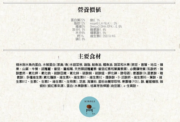 產地 台灣主要原料:糙米,脫水魚肉粉,干紅菜頭根,水解蛋白(家禽/魚),禽脂,鮭魚油,鱈魚油,菜蔬和水果(豌豆、苜蓿、地瓜、蘋果、山藥、牛蒡、胡蘿蔔、西紅柿、蔓越莓),必需礦物質、多種維生素,芝麻,海藻粉,蛋粉,絲蘭萃取物,果寡糖(FOS),牛磺酸,葡萄糖胺,蛋白(水果酵素),枯草芽孢杆菌,α-生育酚。營養價值:蛋白質22%,脂肪12%,纖維5.0%,灰分7.0%,水分8.0%,鈣1.0%,磷0.8%,鈉0.1%,Ω6 3.0%,Ω3 0.6%,賴氨酸1.4%,精氨酸1.5%,維生素E 350IU/KG卡路里(ME)︰3450Kcal/KG保存期限 18個月重量(kg) 10kg保存方式 避免放置潮濕處 、 避免放置太陽照射處 、 請儘快食用完畢鑑賞期並非試用期,本商品一經拆封使用,恕無法辦理退貨,退貨的商品必須為全新狀態且完正包裝,敬請見諒,商品請以實體為主 。