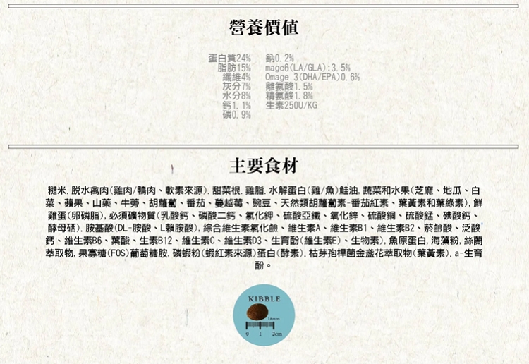 產地 台灣【嚴選食材】糙米、脫水禽肉(雞肉/鴨肉、軟骨素來源))、甜菜根、雞脂、水解蛋白(雞/魚)、三文魚油、蔬菜和水果(芝麻、地瓜、白菜、蘋果、山藥、牛蒡、胡蘿蔔、番茄、蔓越莓、豌豆、天然類胡蘿蔔素-番茄紅素、葉黃素類和葉綠素)、鮮雞蛋(卵磷脂)、礦物質、氨基酸(DL-蛋氨酸、L-賴氨酸)、維生素、魚膠原蛋白、海藻粉、絲蘭萃取物、果寡糖FOS、葡萄糖胺、磷蝦粉(蝦紅素來源)、蛋白(酵素)、枯草芽孢桿菌、金盞花萃取物、α-生育酚。【營養價值】蛋白質24%,脂肪15%,纖維4%,灰分7%,水分8%,鈣1.1%,磷0.9%,鈉0.2%,ω6 3.5%,ω3 0.6%,離氨酸1.5%,精氨酸1.8%,維生素E 250IU/KG卡路里(ME):3550Kcal/KG保存期限 18個月重量(kg) 10kg保存方式 避免放置潮濕處 、 避免放置太陽照射處 、 請儘快食用完畢鑑賞期並非試用期,本商品一經拆封使用,恕無法辦理退貨,退貨的商品必須為全新狀態且完正包裝,敬請見諒,商品請以實體為主 。