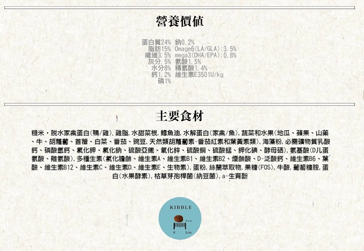 產地 台灣主要原料:糙米,脫水家禽蛋白(鴨/雞),禽脂,干紅菜頭根,鱈魚油,水解蛋白(家禽/魚),菜蔬和水果(地瓜、蘋果、山藥、牛蒡、胡蘿蔔、苜蓿、白菜、西紅柿、豌豆),海藻,必需礦物質、氨基酸(DL蛋氨酸、賴氨酸)、多種維生素,蛋粉,絲蘭萃取物,果寡糖(FOS),牛磺酸,葡萄糖胺,蛋白(水果酵素),枯草芽孢杆菌,α-生育酚。營養價值:蛋白質24%,脂肪15%,纖維3.5%,灰分7.5%,水分8.0%,鈣1.2%,磷1.0%,鈉0.2%,Ω6 3.5%,Ω3 0.8%,賴氨酸1.5%,精氨酸1.4%,維生素E 350IU/KG卡路里(ME):3650Kcal/KG保存期限 18個月重量(kg) 12kg保存方式 避免放置潮濕處 、 避免放置太陽照射處 、 請儘快食用完畢鑑賞期並非試用期,本商品一經拆封使用,恕無法辦理退貨,退貨的商品必須為全新狀態且完正包裝,敬請見諒,商品請以實體為主 。