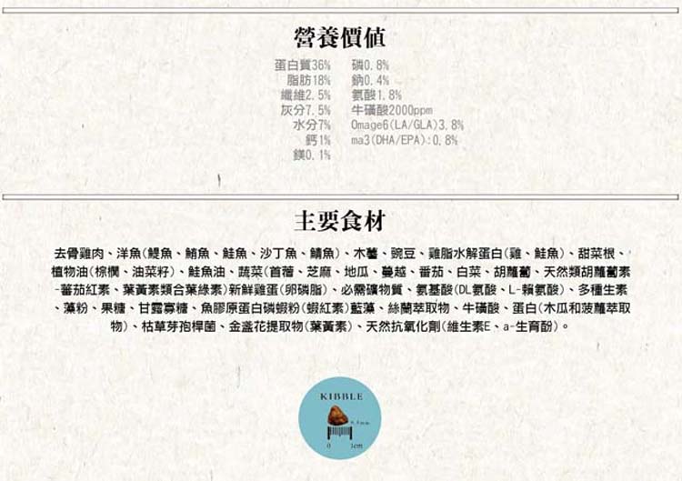 產地 台灣主要成分:去骨雞肉、海洋魚(鯷魚/鱈魚/鮭魚/鮪魚/沙丁魚/鯖魚)、木薯、豌豆、雞脂、水解蛋白(雞/鮭魚)、甜菜根、植物油(棕櫚、油菜籽)、鮭魚油、蔬菜(苜蓿、芝麻、地瓜、蔓越莓,番茄、白菜、胡蘿蔔、天然類胡蘿蔔素-番茄紅素、葉黃素類和葉綠素)、鮮雞蛋(卵磷脂)、必需礦物質、氨基酸(DL蛋氨酸、L-賴氨酸)、維生素、海藻粉、果寡糖、甘露寡糖、魚膠原蛋白、磷蝦粉(蝦紅素)、藍藻、絲蘭萃取物、牛磺酸、蛋白(木瓜和菠蘿萃取物)、枯草芽孢桿菌、金盞花提取物(葉黃素)、天然抗氧化劑(維生素E、α-生育酚)。營養價值:蛋白質36%、脂肪18%、纖維2.5%、灰分7.5%、水分7%、鈣1%、鎂0.1%、磷0.8%、鈉0.4%、ω6 3.8%、ω3 0.8%、離氨酸1.8%、 牛磺酸2000ppm卡路里(ME):3750Kcal/KG保存期限 18個月重量(kg) 7.5kg保存方式 避免放置潮濕處 、 避免放置太陽照射處 、 請儘快食用完畢鑑賞期並非試用期,本商品一經拆封使用,恕無法辦理退貨,退貨的商品必須為全新狀態且完正包裝,敬請見諒,商品請以實體為主 。