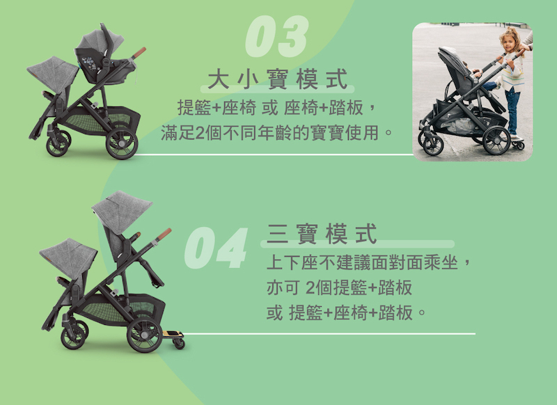 全面升級 | 全新體驗●全天候舒適座椅後背採用透氣式網布設計,同時配有可拆卸椅墊,能對應不同溫度及氣候更換。●避震強化再提升大尺寸輪胎,搭配FlexRide懸吊式避震,回彈不觸底。輕鬆乘載1-3個寶寶,面對各種地形不顛簸。並採用單腳煞車系統。●全新設計反光條車輪外框上新增反光條,讓夜晚外出更加安心安全。●五點式安全帶升級磁吸式安全扣,一鍵調節安全帶,輕鬆方便操作。●質感美學設計-鋁鎂合金材質,兼具輕量化與耐用性。手把連接處,高光設計使材質更絲滑。-手把和防撞桿以REACH認證的真皮皮革包覆。-隱藏式鉚釘設計,營造出更為精緻的美學效果。●最高規格認證GREENGUARD金牌認證,給予清新與健康的環境。●One for all 百變模式及功能-頂級車款,最多可擴充至2個座椅及一組輔助踏板。並可搭配睡箱及提籃。-座椅高度較高,出外可直接當兒童餐椅使用。兩組座椅皆可調整前後兩個方向,也能躺平至180度。-超大容量的置物空間,內容物輕鬆方便取放。-可伸展的遮陽罩,具有防潑水功能,及防曬系數超過UPF 50+,可遮擋有害的紫外線。易開啟且透氣的通風窗,可隨時觀看寶寶的狀況。