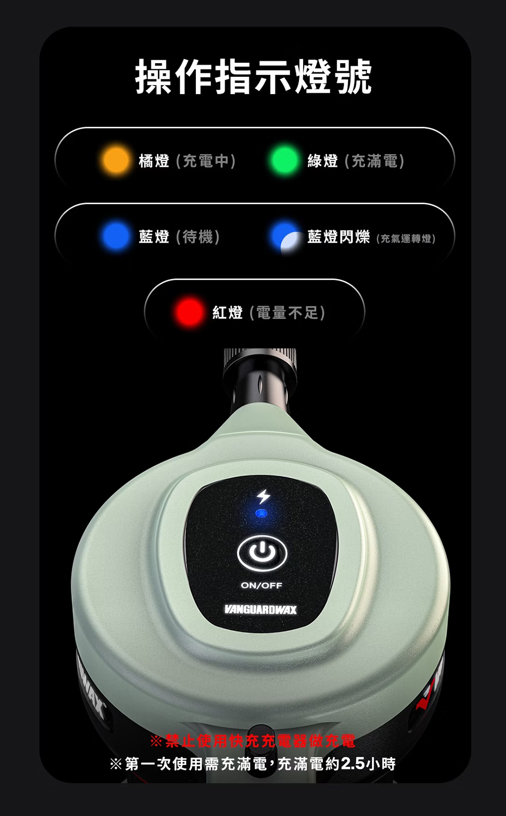 【指示燈說明】‧橘燈:充電中‧綠燈:充滿電‧藍燈:待機中‧藍燈閃爍:充氣運轉中‧紅燈:蓄電不足或電機故障※三分鐘不使用會自動關機,如果要繼續使用,要再按一次開關顯示成藍色燈